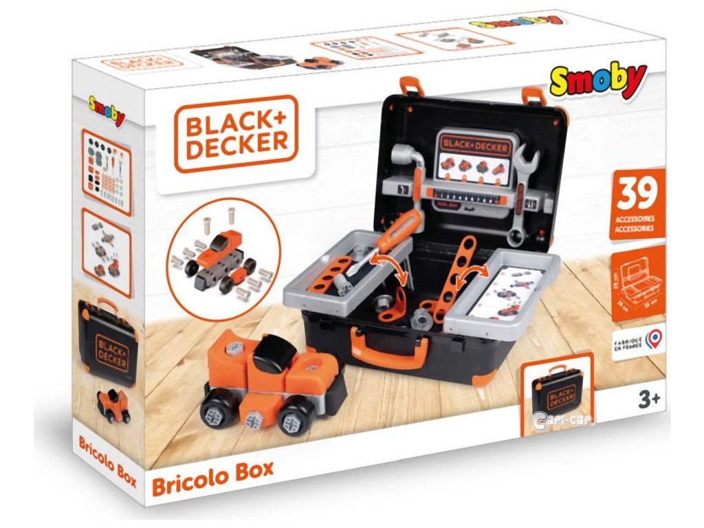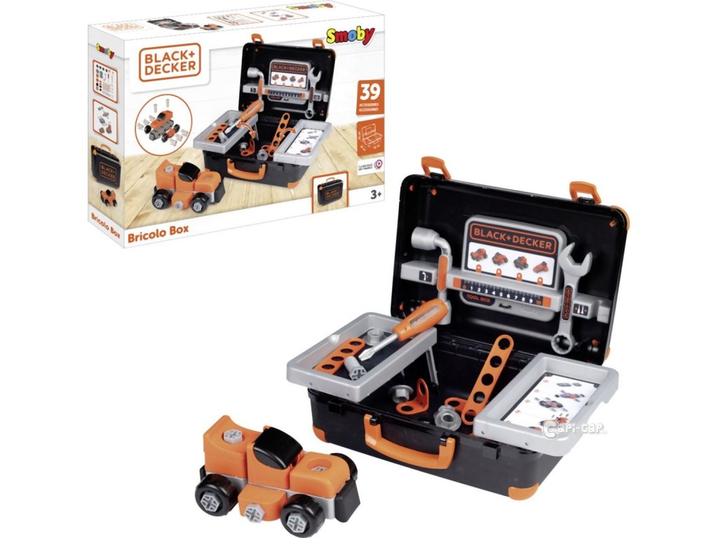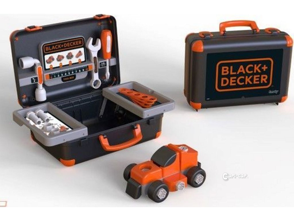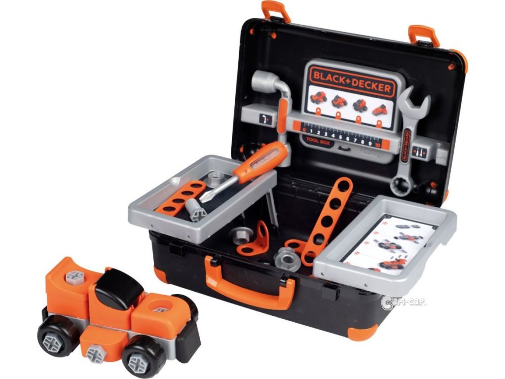Kufr na nářadí v licenci Black&Decker s výklopnými úložnými přihrádkami, autíčkem pro montáž /demontáž. Nechybí nářadí, šroubky, matičky a další příslušenství.