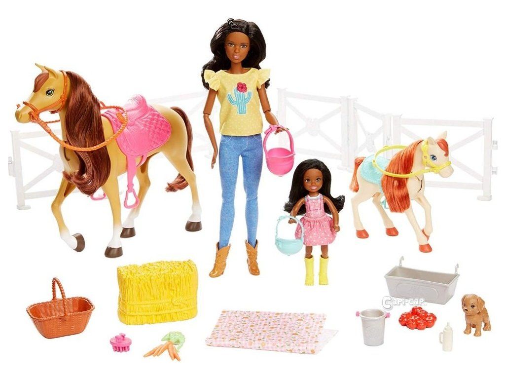 V herním setu na tebe navíc čeká více než 20 doplňků, díky kterým můžeš vytvářet nejrůznější příběhy podle své fantazie. Postav ohradu, dej koníkům seno a další dobroty do žlabu, použij lahve na vodu a vykartáčuj je pomocí hřebenu. A to ještě není vše! V setu na tebe čeká dokonce i štěňátko! Vezmi sedlo a uzdu a připrav koníky na projížďku. Panenky Barbie® a Chelsea™ si oblékly jezdecké botky a helmy a již se nemohou dočkat, až společně vyrazíte za dobrodružstvím a užijete si společně den ve stáji.