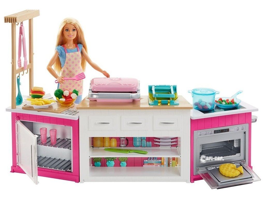 V setu na tebe čeká šéfkuchařka Barbie®, kuchyňská linka, kuchyňské spotřebiče, nástroje potřebné k vaření a servírování a těsto v pěti různých barvách, z kterého snadno uvaříš to nejlepší jídlo. Zvedni kuchyňské prkénko a objevíš zeleninu, kterou může panenka Barbie® nakrájet svým nožem. Pojďme uvařit ty nejlepší dobroty. Připrav chutný sendvič v sendvičovači. Usmaž křupavé hranolky ve fritéze. Ohřej dobroty v hrnci na sporáku. A nezapomeň na dezert! Připrav vynikající koláč a nech jej dozlatova upéct v troubě. Objev, jaké další vychytávky se v kuchyni ukrývají!