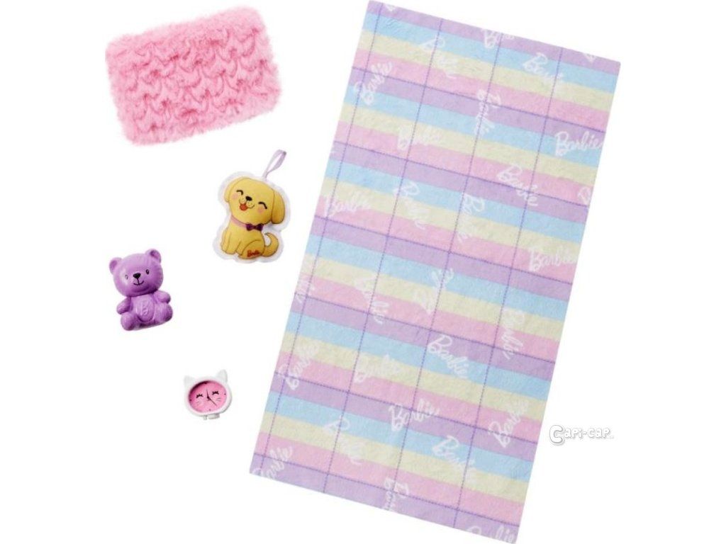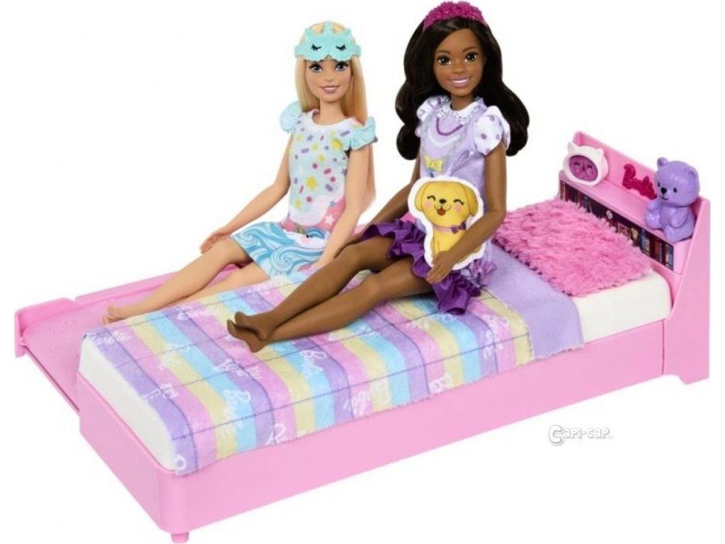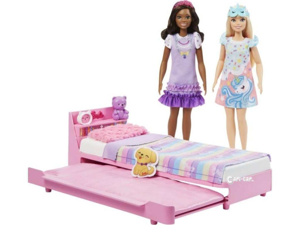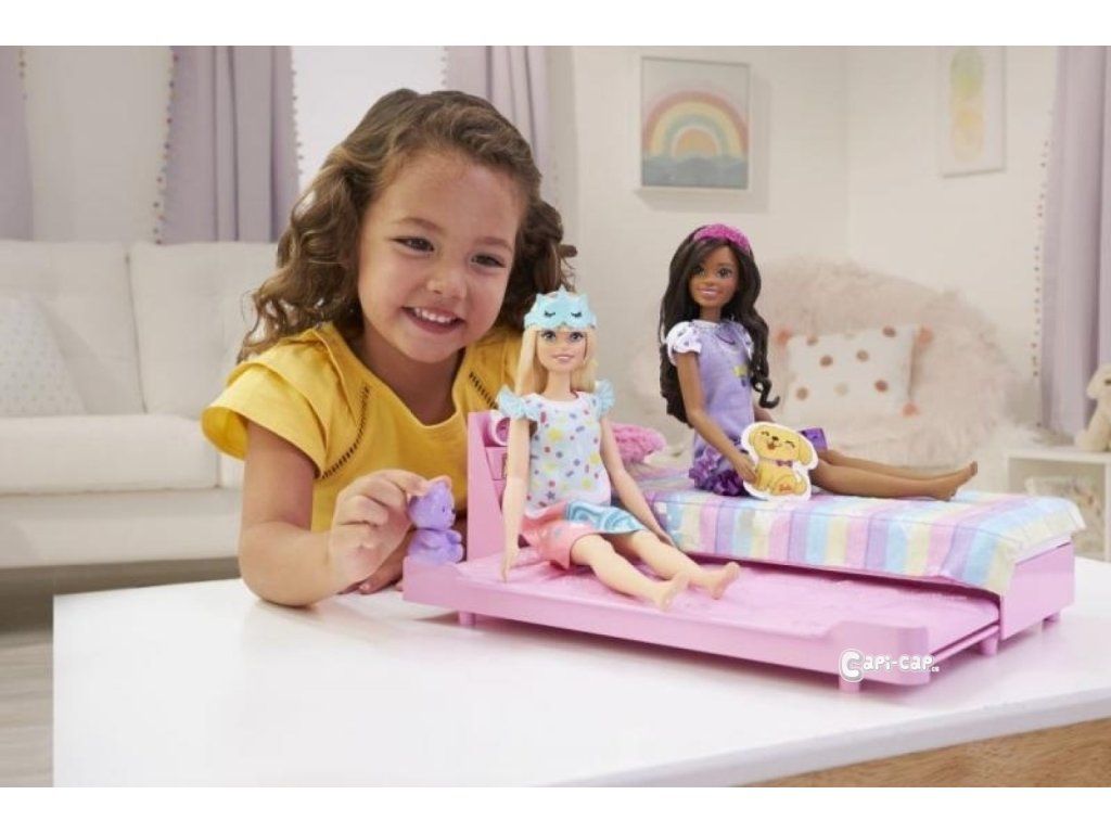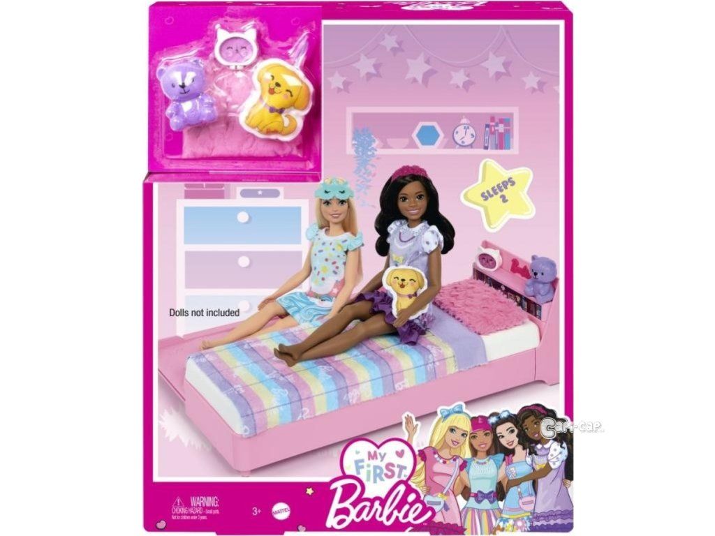 Představujeme novou kolekci hraček Moje první Barbie™, která je speciálně navržena pro předškoláky! Roztomilý a krásně barevný herní set Moje první Barbie™ postýlka inspiruje ke sladkým snům a pečující nápadité hře. Na rozkládací postýlku se vejdou dvě panenky z kolekce Moje první Barbie™ (panenky nejsou součástí balení), které měří 34 cm. Přídavnou matraci můžete schovat nebo vysunout, když přijde kamarádka na přespávací párty! Chlupatý polštářek, měkká deka a plyšové štěňátko dodávají pocit pohodlí. Děti budou chtít svou panenku zachumlat pod peřinu a vyprávět jí kouzelné příběhy, které podporují vlastnosti, jako jsou něha a péče! Mezi další doplňky pro vyprávění příběhů patří medvídek a budík.