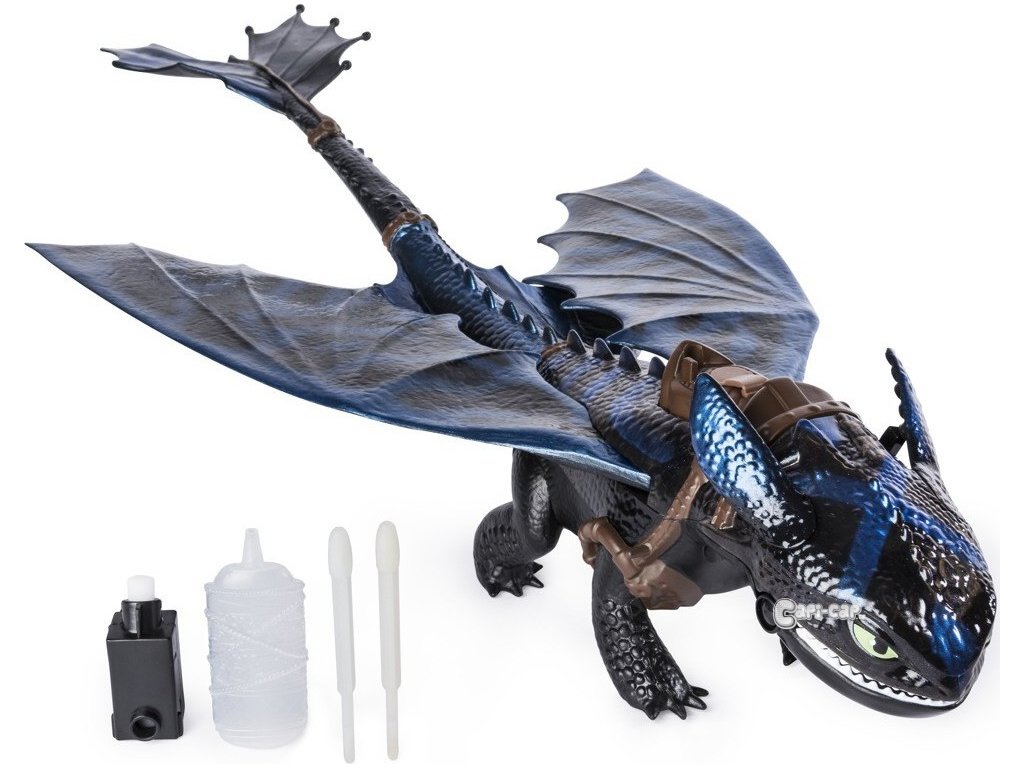 Naplňte záda Bezzubky vodou a použijte k tomu nakapávač. Stiskněte tlačítko za ouškem a Bezzubka ožije světýlky a kouřovým dračím dechem.