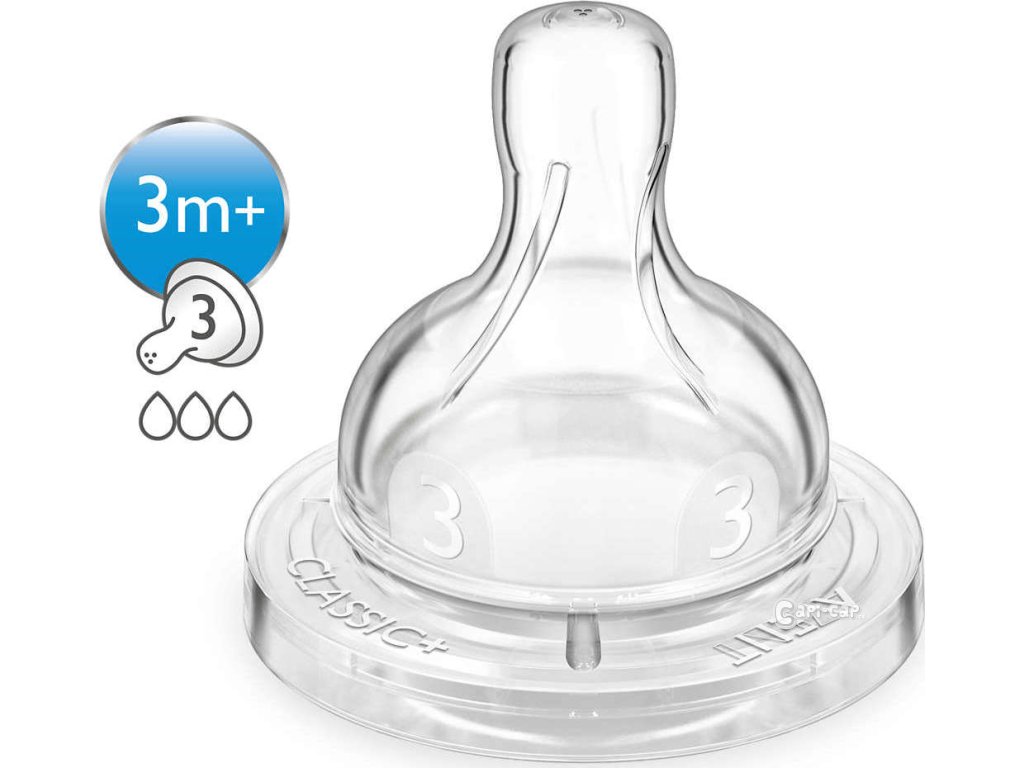 • 3 otvory • střední průtok • 3 m+ Dudlík na láhev AVENTse 3 otvory – se středním průtokem. Pro děti od 3 měsíců. Dudlíky AVENT jsou vyráběny z měkkého a tenkého silikonu. Žebrování je prodlouženo a dudlík je o něco celkově vyšší. Těsnící lem je snížen. Silikonový dudlík AVENT je navržen tak, aby svým tvarem a funkcí co nejvíce připomínal maminčin prs. Má speciální patentovaný okraj, který funguje jako jednosměrný ventil. Dudlík umožňuje proudění vzduchu do lahvičky během krmení, čímž zamezuje vzniku vakua v lahvičce. Dítě se nemusí dudlíku při krmení pouštět a může pít souvisle jako při kojení bez polykání vzduchu. Právě polykaný vzduch během krmení vyvolává pláč způsobený bolestivou kolikou nebo nadýmáním. Klinické pokusy provedené univerzitami v Londýně a Cambridge prokázaly, že novorozenci krmení lahvičkami AVENT trpěli méně kolikami a po probuzení byli spokojenější než děti, které byly krmeny z obyčejných lahví. Široký tvar měkkého dudlíku nutí dítě zeširoka otevřít ústa a doslova se k dudlíku přisát. Může tak začít sát a používat přitom stejné pohyby jazyka a dásní jako při kojení. To je důvod, proč je s AVENTEM snadné kombinovat kojení s krmením z lahvičky.