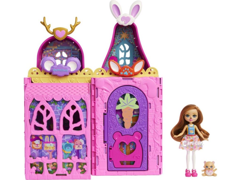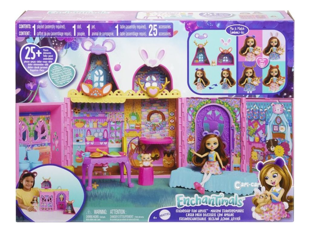 V Domečku přátelství Enchantimals™ je vítán každý! Přijďte si vyzkoušet proměňující se herní set, který umožňuje přizpůsobení hry pro panenky i nejlepší kamarády. Domeček se otevírá do sedmi hracích zón včetně kuchyně, koupelny, ložnice a dokonce i střešního bazénu! K dispozici je 24 doplňků, se kterými si děti mohou v domě přehrávat nespočet příběhů mezi panenkami a nejlepšími kamarády.
