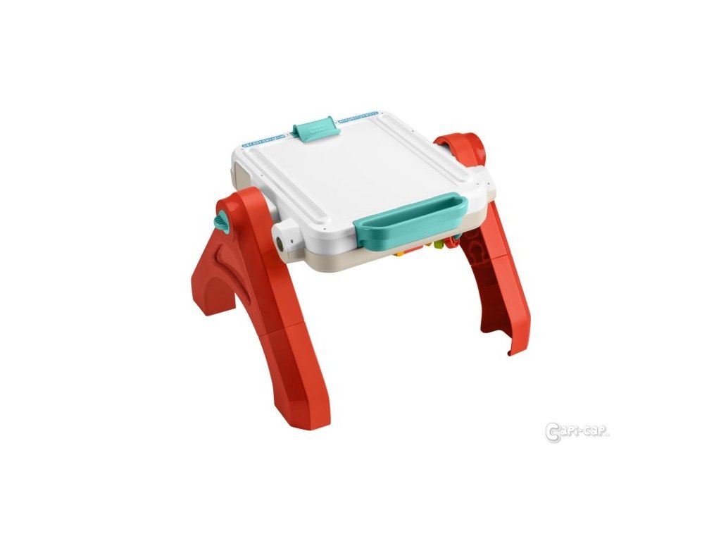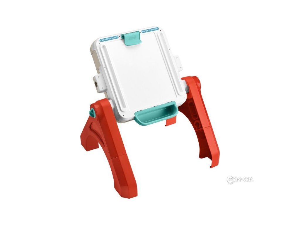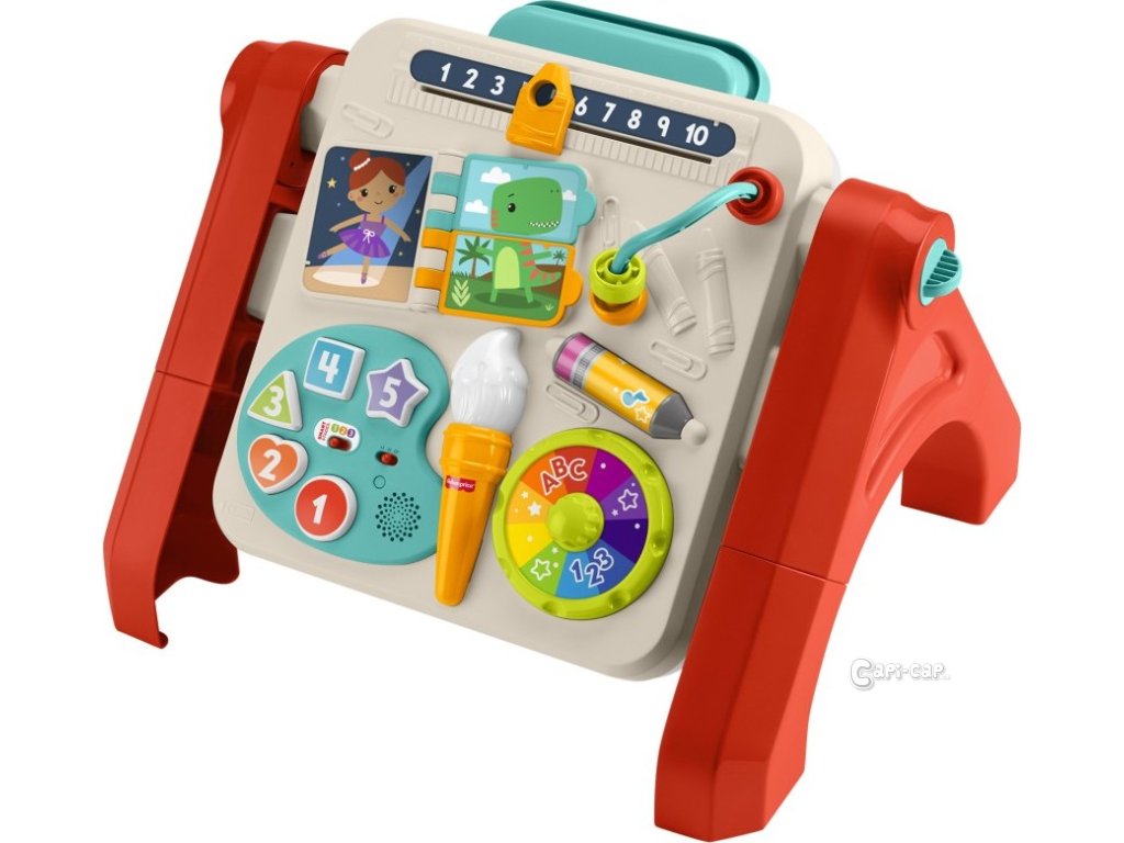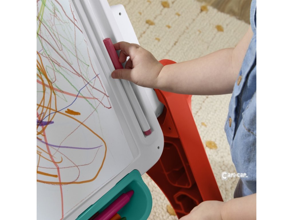 Hrací stoleček a stojan 4 v 1 od Fisher-Price roste s dítětem – je s ním od sezení, přes stání až po tvoření! Interaktivní stoleček nabízí 4 režimy hraní pro děti a batolata – režim pro sedící dítě, režim aktivního stolu pro stojící dítě, režim otevřeného stolu pro batole, které si může přinést knihy, hračky nebo výtvarné potřeby a v neposlední řadě režim stojací tabule pro malé umělce. Aktivní strana obsahuje paletu umělce, která učí čísla, barvy a tvary, točící se barevné kolečko, které aktivuje hudbu, a klasické zábavné aktivity jako otočná knížka, korálková lišta a spinner. Různé úrovně Smart Stages, díky které hračka roste s dítětem, obsahuje více než 125 zvuků, frází a písní. Strana s tabulí má klip na papír, zásobník na výtvarné potřeby a zářezy na stranách pro uchycení fixů a pastelek. Barvy a vzhled výrobku se mohou lišit.
