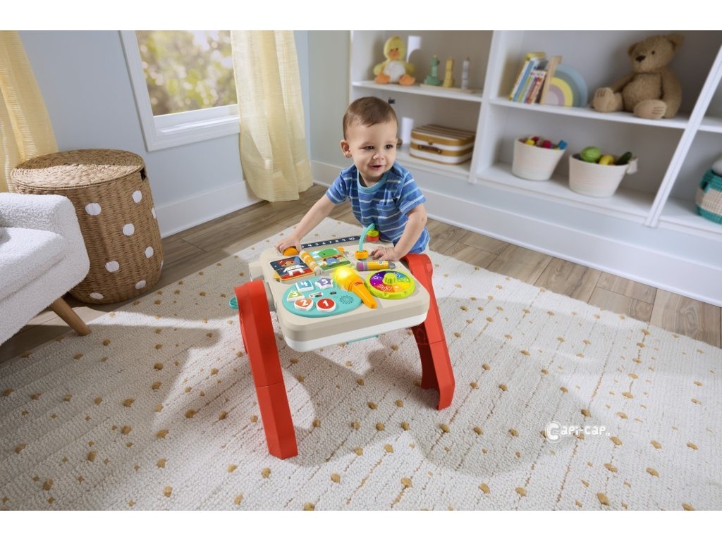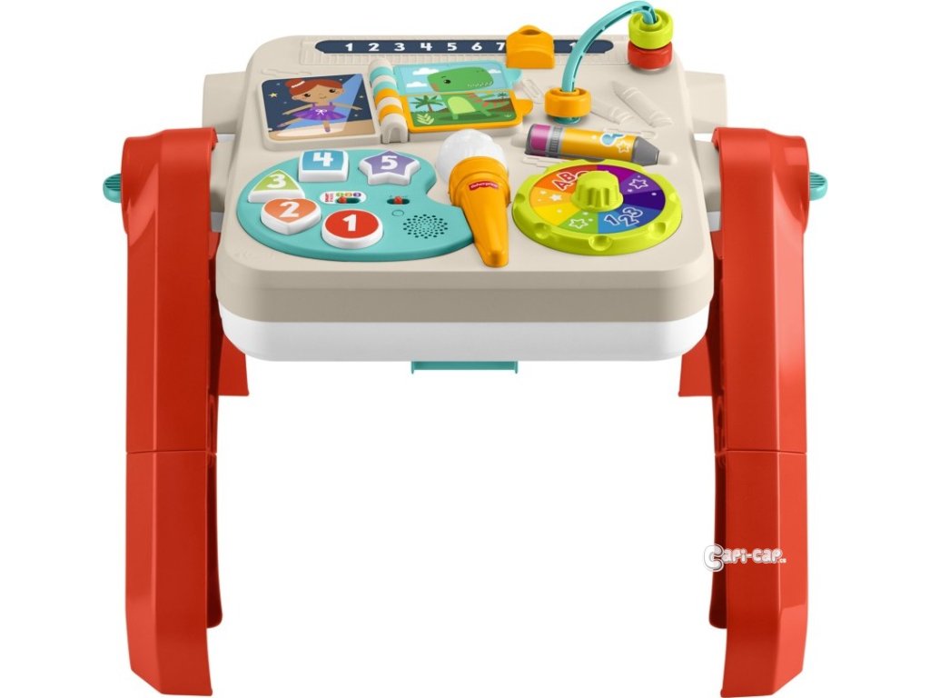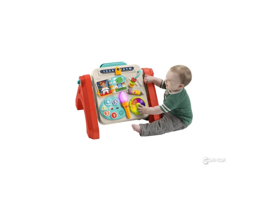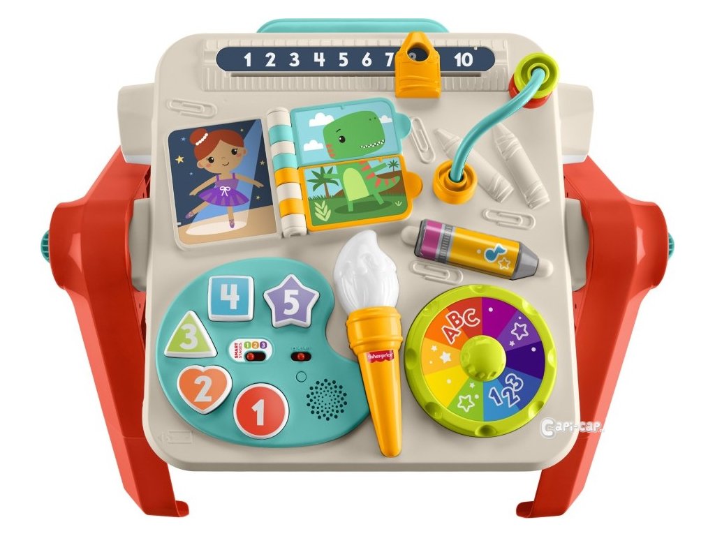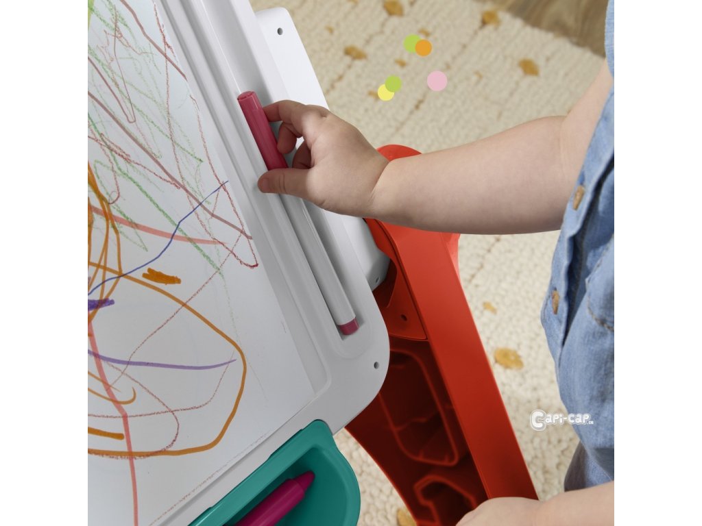 Hrací stoleček a stojan 4 v 1 od Fisher-Price roste s dítětem – je s ním od sezení, přes stání až po tvoření! Interaktivní stoleček nabízí 4 režimy hraní pro děti a batolata – režim pro sedící dítě, režim aktivního stolu pro stojící dítě, režim otevřeného stolu pro batole, které si může přinést knihy, hračky nebo výtvarné potřeby a v neposlední řadě režim stojací tabule pro malé umělce. Aktivní strana obsahuje paletu umělce, která učí čísla, barvy a tvary, točící se barevné kolečko, které aktivuje hudbu, a klasické zábavné aktivity jako otočná knížka, korálková lišta a spinner. Různé úrovně Smart Stages, díky které hračka roste s dítětem, obsahuje více než 125 zvuků, frází a písní. Strana s tabulí má klip na papír, zásobník na výtvarné potřeby a zářezy na stranách pro uchycení fixů a pastelek. Barvy a vzhled výrobku se mohou lišit.