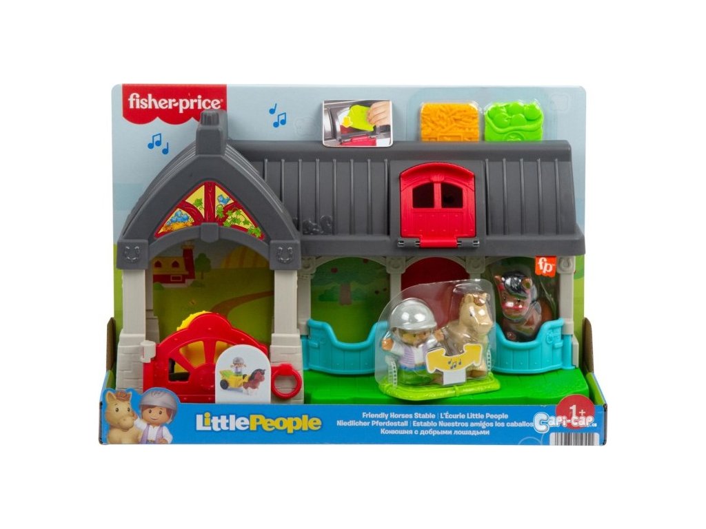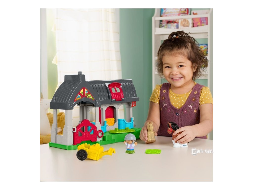 Koňské stáje obsahují vše, co je potřeba ve skutečné stáji – postavičku malého farmáře, pokoníky, krmení, seno a kolečko.