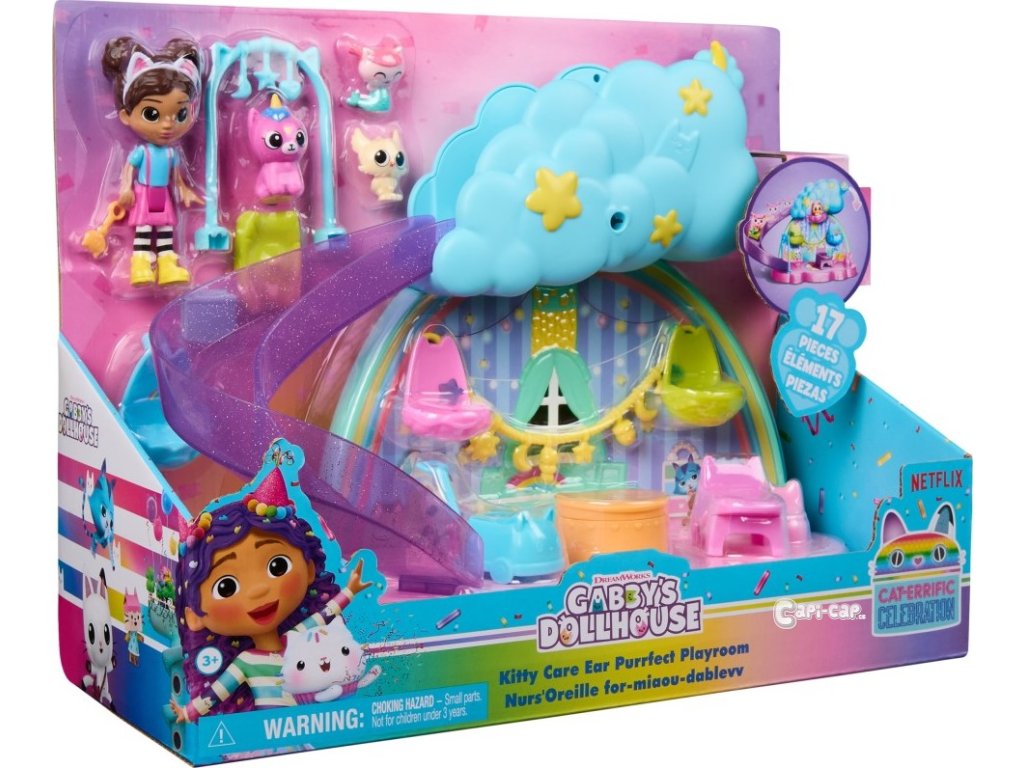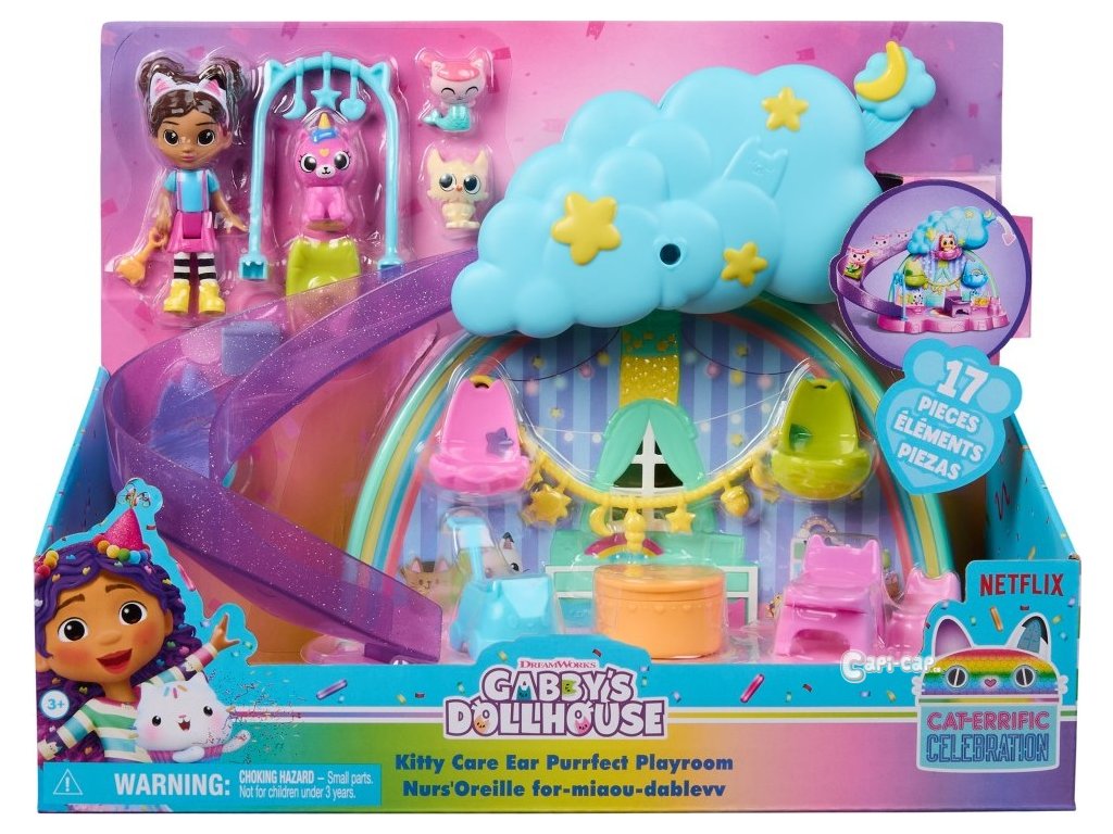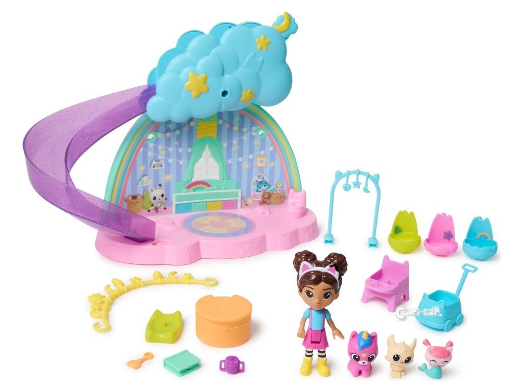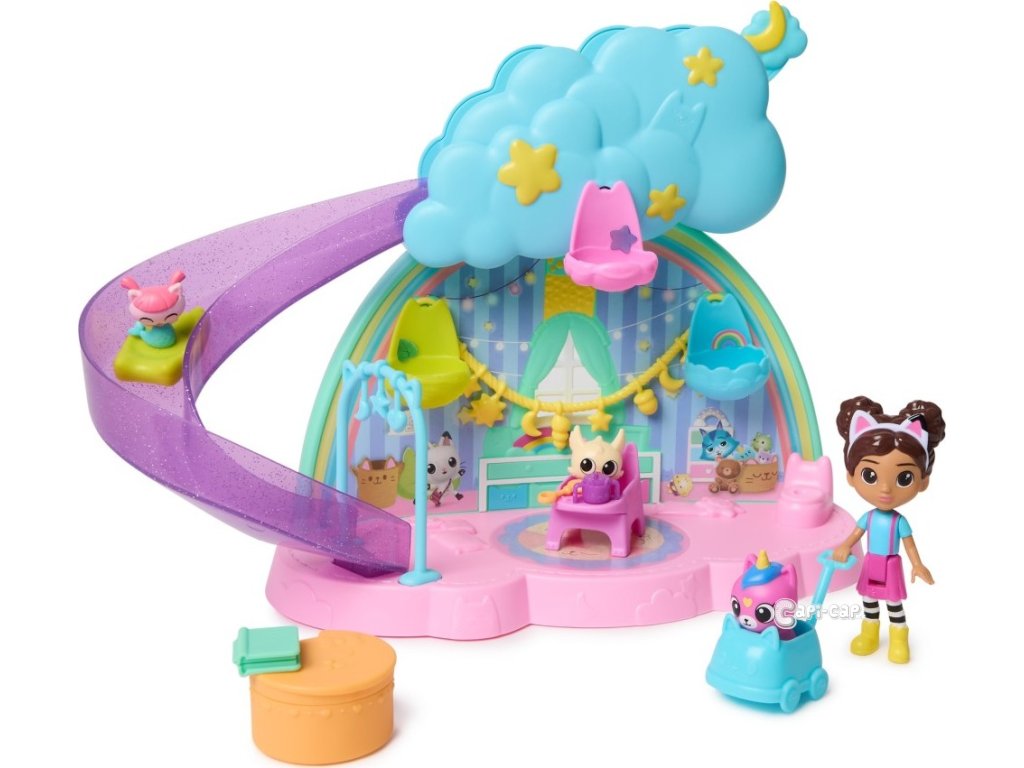 Vytvářej vzrušující dobrodružství s hlídáním dětí s Gábinou a koťátky v hrací sadě Jesličky! Tato 17dílná hrací sada obsahuje figurku Gábiny, 3 koťátka a jesličky plné překvapení! Střídejte se na skluzavce, vychutnejte si procházky v kočárku, při jídle používejte vysokou židličku a poté rozbalte kouzelný domek, abyste objevili hračku s překvapením, naskenováním QR kódu v zásilce odemknete odměnu v aplikaci Gábinin kouzelný domek! Po skončení hry je uložte do dětských postýlek a ukolébejte je ke spánku. Hračky pro dívky a chlapce z Gábinina kouzelného domku jsou skvělé dárky pro děti, které si ve svých představách rádi budují vlastní světy. Zajistěte jim nezapomenutelný zážitek se světem roztomilých figurek, doplňků a nábytku do kouzelného domku, které mohou sbírat a libovolně skládat! Postavte si vlastní svět se základními stavebnicemi, jako je kuchyňka na hraní nebo hudební místnost, a spoustou sběratelských předmětů, jako je úžasná výletní loď, bazén pro mořské panny nebo zbrusu nová souprava Párty pokoj – podkroví kouzelného domku s krytým skateparkem a roztomiloučkými balkónky s mini antistresovými hračkami, které poskytují uspokojivou senzorickou hru a lze je bezproblémově zkombinovat s oběma verzemi kouzelného domku!
