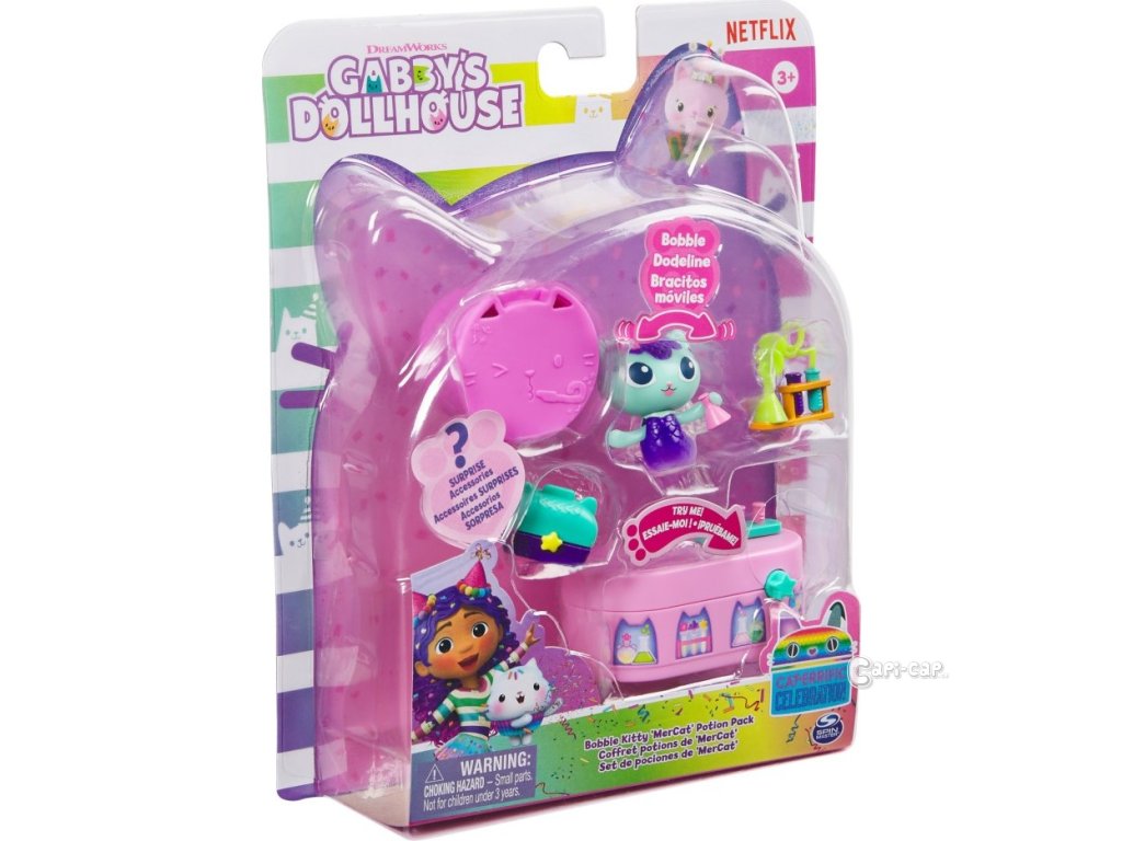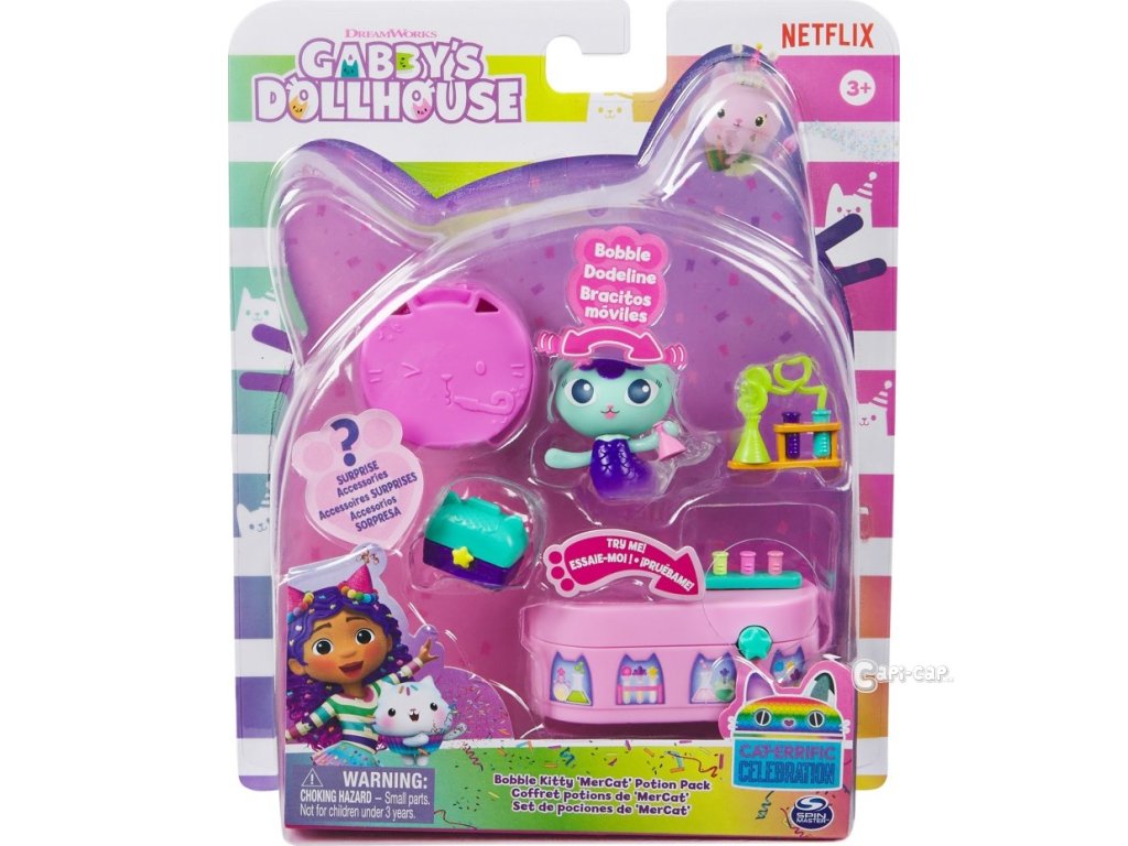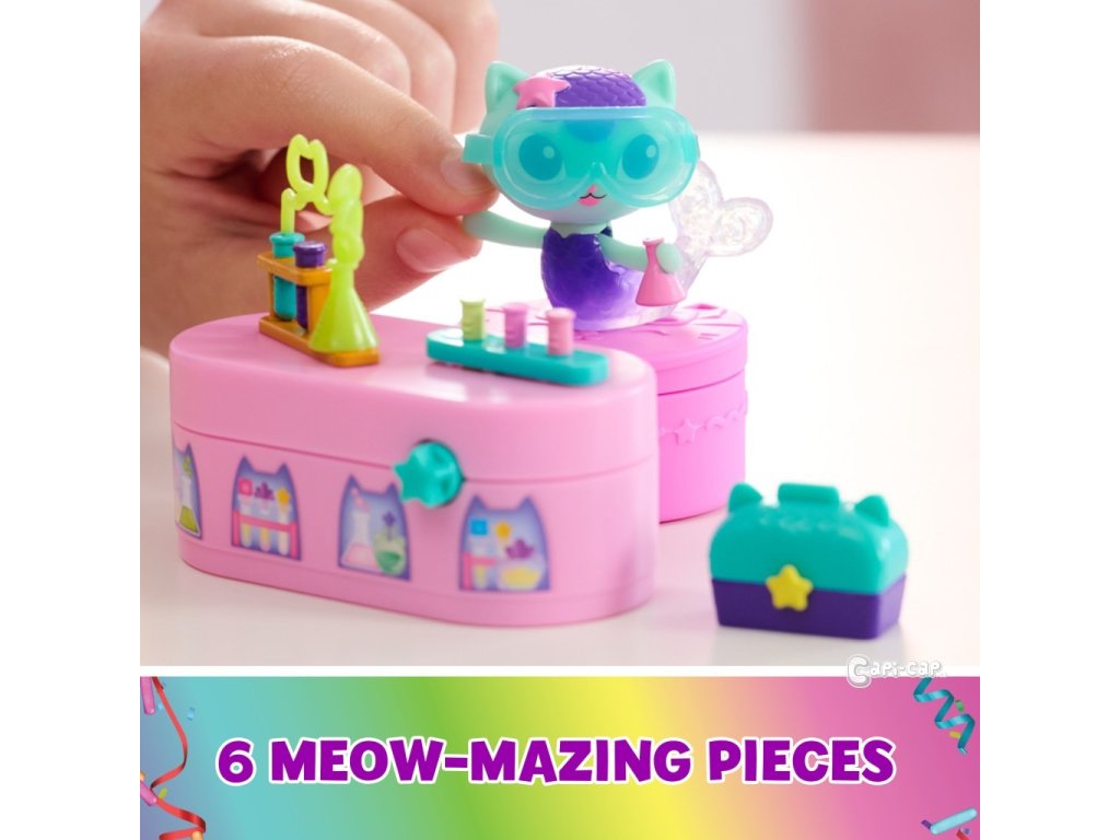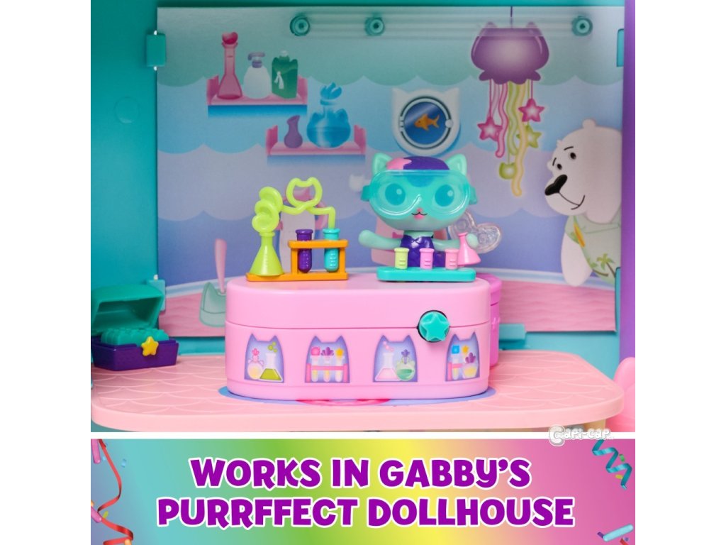 Spojte se s Rybočkou a užijte si vzrušující dobrodružství v umělecké dílně kouzelného domku. Rybočka je oblečená ve svém charakteristickém oblečení z Gábinina kouzelného domku a spolu s ní zde najdete i její sadu se zkumavkami a všechny její kočičí věcičky! Součástí sady je také laboratorní stůl se skrytým aktivačním tlačítkem, když pak hvězdu stisknete, zkumavky se objeví nahoře na pultu, či zase zpátky pod ním! Pak rozbalte domeček pro panenky, stejně jako Gábina v každé epizodě, a objevte hračku s překvapením – laboratorní brýle, které můžete Rybočce nasadit! Všechny hračky z Gábinina kouzelného domečku jsou navrženy tak, aby se daly vzájemně propojit, takže pokud si chcete hrát ještě více způsoby, získejte Gábininu výletní loď, Gábinin mňautastický domeček a tematický pokojíček do domečku, abyste si ještě více dotvořili svět svého kouzelného domku (prodávají se zvlášť)! Plyšáci, panenky s doplňky, figurky a hrací sady na motiv Gábinina kouzelného domku jsou perfektními vzdělávacími hračkami pro dívky a chlapce, kteří rádi zapojují svou představivost k vytvoření svého vlastního světa v kouzelném domku, takže se připravte na nekonečná dobrodružství s touto malou hrací sadou!