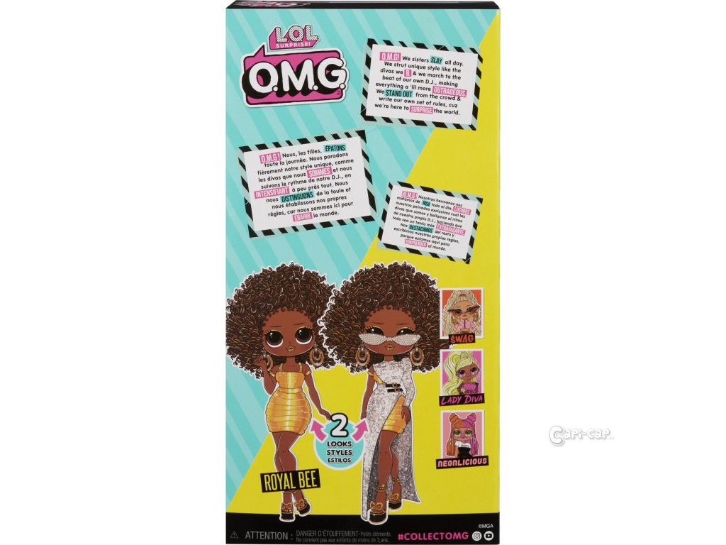 Obsah balení: • 1 ze 4 OMG Velkých séger • mnoho překvapení, včetně různých módních doplňků • kartáč na vlasy • stojan pro panenku