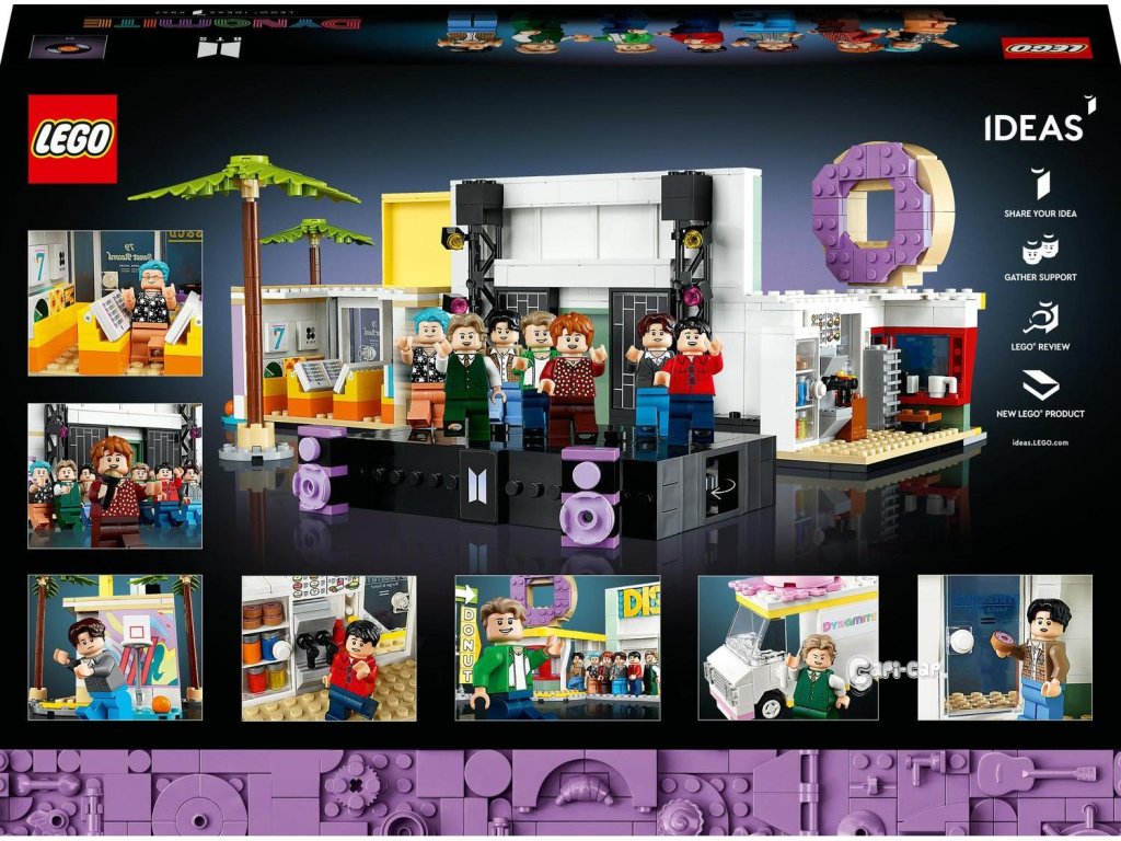Zachyťte radostnou energii popových ikon 21. století se stavebnicí videoklipu BTS Dynamite od LEGO® Ideas (21339) – RM, Jin, SUGA, j-hope, Jimin, V and Jung Kook. Postavte si LEGO verze pestrobarevných scén z videoklipu k jejich multiplatinovému singlu Dynamite – diskotéku, obchod s hudebními deskami, obchod s donuty, zmrzlinářský vůz a další. Postavte všechny LEGO minifigurky BTS na různá místa nebo na odnímatelné pódium a otáčením kola je roztančete. Dokonalá replika videa Dynamite Tento model na stavění a hraní je úžasný dárek pro fanoušky BTS a je plný autentických detailů, jako jsou alba BTS v obchodě s hudebními deskami, sestavitelné palmy a basketbalový koš před malovanou zdí. Návod k sestavení tohoto zábavného modelu najdete v krabici a v aplikaci LEGO Builder, která vás provede každým krokem. Vítejte ve svém světě Prohlédněte si kolekci impozantních stavebnic LEGO pro dospělé. Ať už vás baví cokoli, určitě máme tu pravou sadu přímo pro vás.