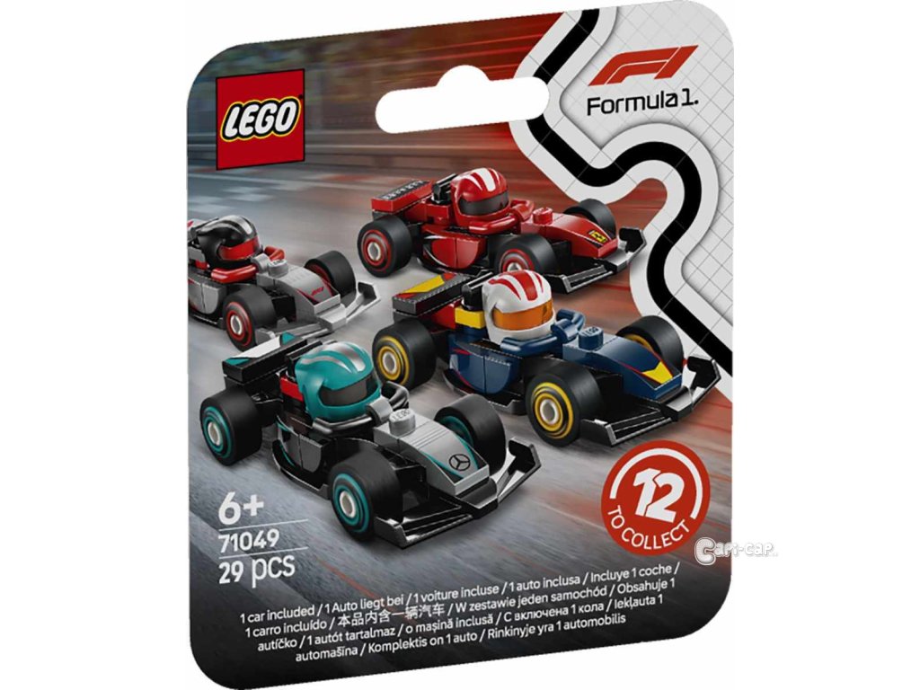 V každém balení najdete 1 model auta F1. Nasbírejte jich celkem 12: Vůz F1, F1 ACADEMY™ a vozy 10 týmů Formule 1: RB20, Mercedes-AMG, Ferrari, McLaren, Aston Martin, Alpine, Williams, VCARB, Sauber a Haas.