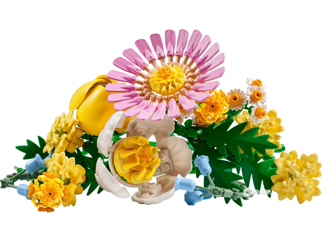 Květiny LEGO® – Kytice se skládá z 7 druhů jarních květin v pastelových odstínech, včetně kraspédie, zvonků, kapradin, žlutého řebříčku, gerbery, pivoňky a tulipánu