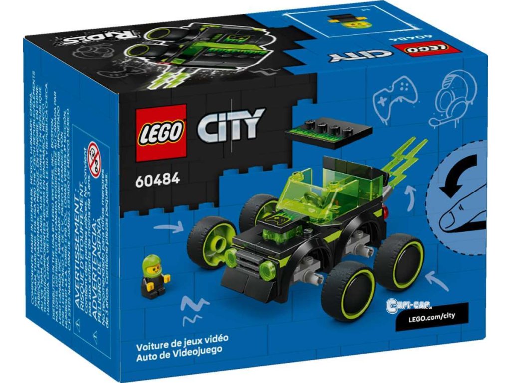 LEGO® 60484 City Autíčka – Herní závodní auto je miniaturní stavebnice určená dětem od pěti let, která nabízí zábavný a kreativní zážitek při stavění a hraní. Tento model závodního auta je navržen tak, aby upoutal pozornost díky svému výraznému designu v černé a výrazně zelené barvě s průhlednými zelenými prvky, které připomínají blikající herní efekty. Auto má čtyři velké gumové pneumatiky s neonově zeleným pruhem, které dodávají celkovému vzhledu dynamiku a připravují model na rychlé závody. Kokpit je doplněn průhledným zeleným štítem, za kterým může sedět minifigurka řidiče oblečená v černém obleku a helmě ve stejné zelené barvě.