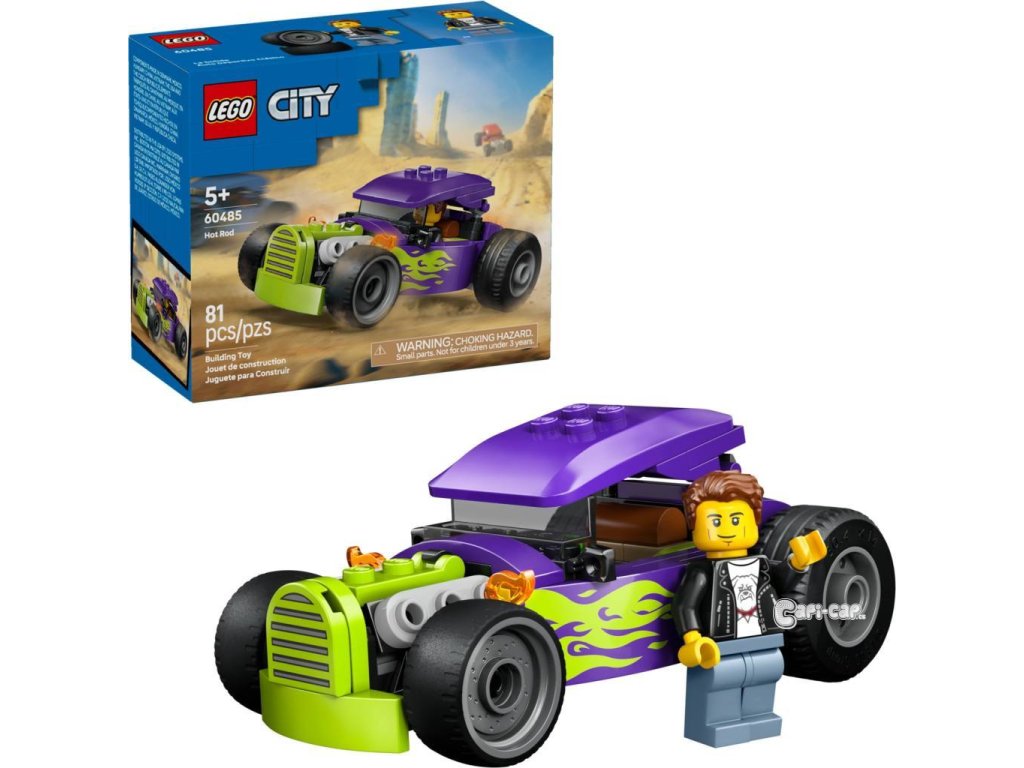 LEGO® 60485 City Hot rod je stavebnice určená pro děti od pěti let, které milují závodní auta a kreativní stavění. Tento model představuje klasický závodní hot rod v poutavém fialovém provedení s výraznými neonově zelenými plameny na bocích karoserie. Konstrukce vozu je propracovaná s důrazem na detaily, které zahrnují obrovská zadní kola s výrazným vzorkem, přední kola menší velikosti a originální motor s čelním zeleným krytem. Zajímavým prvkem je zvedací střecha kokpitu, která umožňuje snadné usazení minifigurky řidiče do sedadla.
