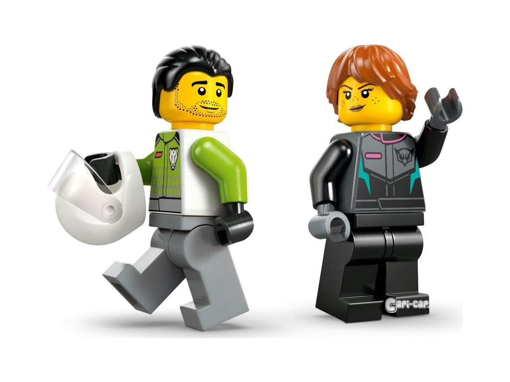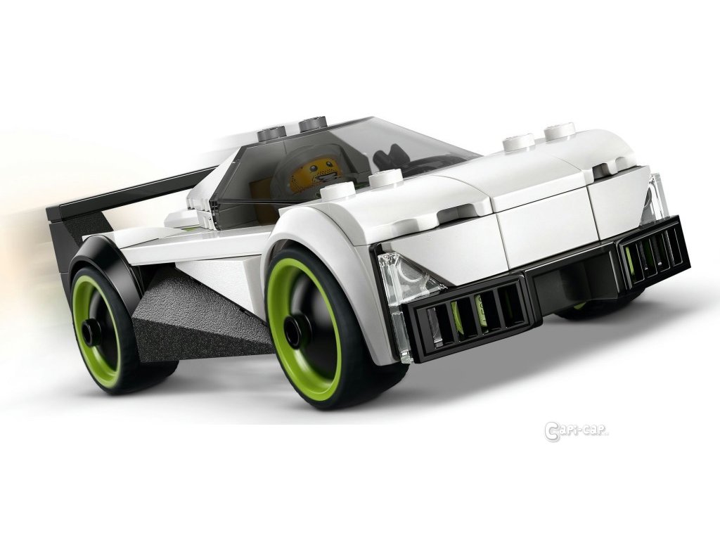Supersportovní auto je sestaveno především z bílých a černých dílků s kontrastními zelenými detaily na kolech, což mu dodává moderní a rychlý vzhled. Může se pochlubit propracovaným interiérem, který je přístupný otevřením kokpitu, kde mohou děti umístit minifigurku závodního řidiče. Model je doplněn o dvě minifigurky – pilota letadla a závodního řidiče – oblečené v odpovídajících kostýmech, které podporují scénáře roleplay a rozvíjí dětskou představivost.