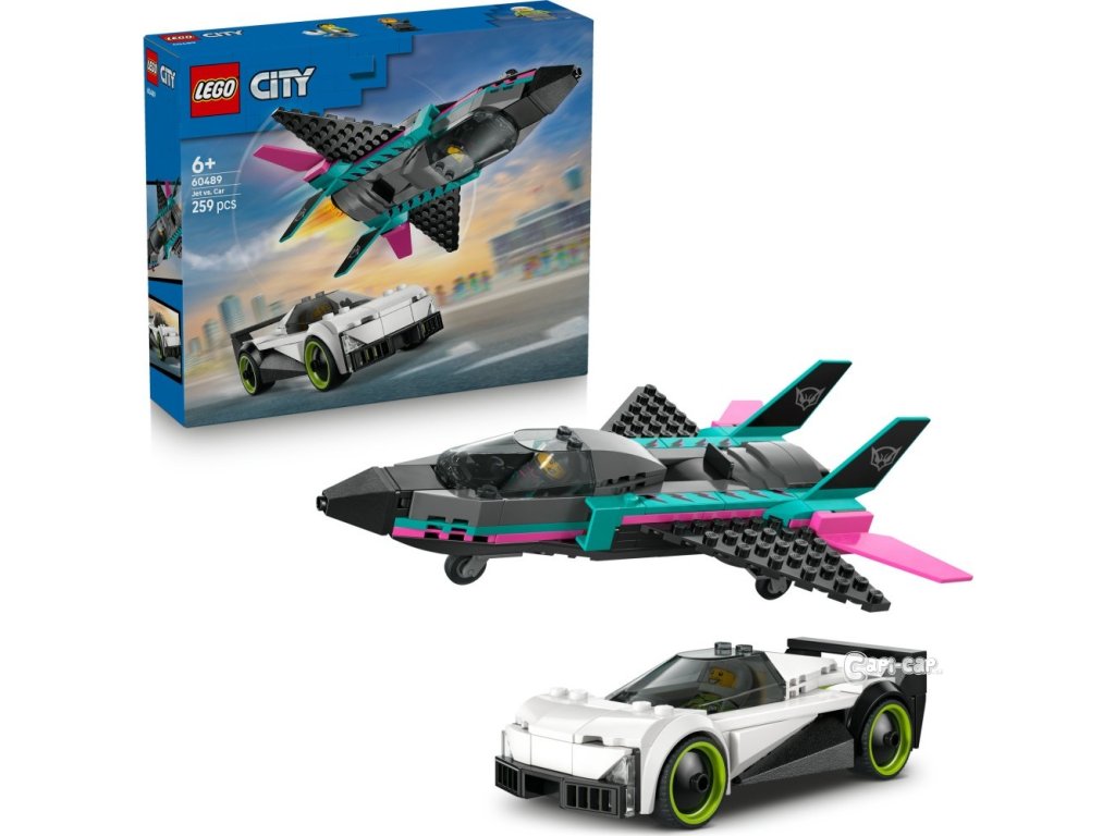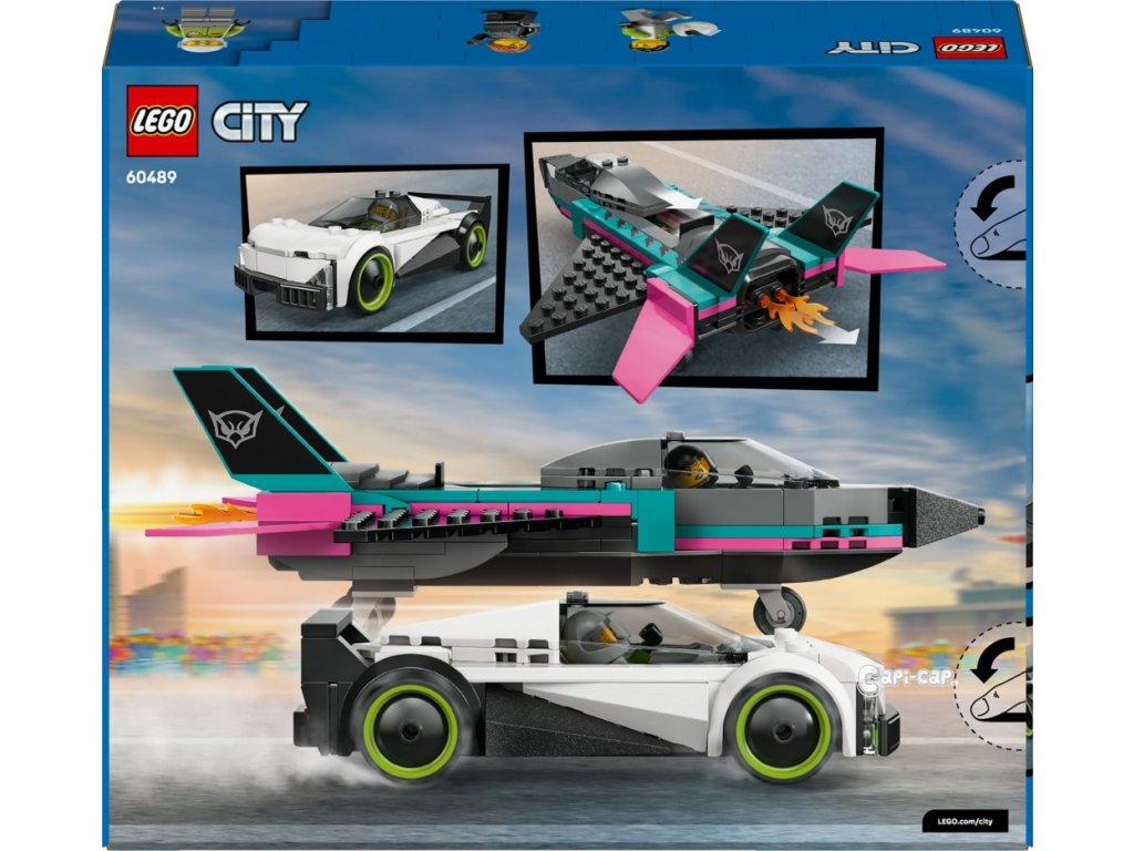LEGO® 60489 City Tryskáč vs. auto je stavebnice určená pro děti od 6 let, která nabízí vzrušující kombinaci supersportovního auta a nadzvukového letadla. Celkem obsahuje 259 dílků, které umožňují sestavit rychlá a elegantní vozidla připravená ke strhujícím závodům. Letadlo má výrazný design s černými křídly se šípovitým profilem, růžovými směrovými plochami a stabilizátory, které dodávají modelu aerodynamický vzhled. Dvojitá vertikální křidélka a přídavné spalování, které lze aktivovat posunutím páčky, podtrhují dynamiku a zábavnost hraní.