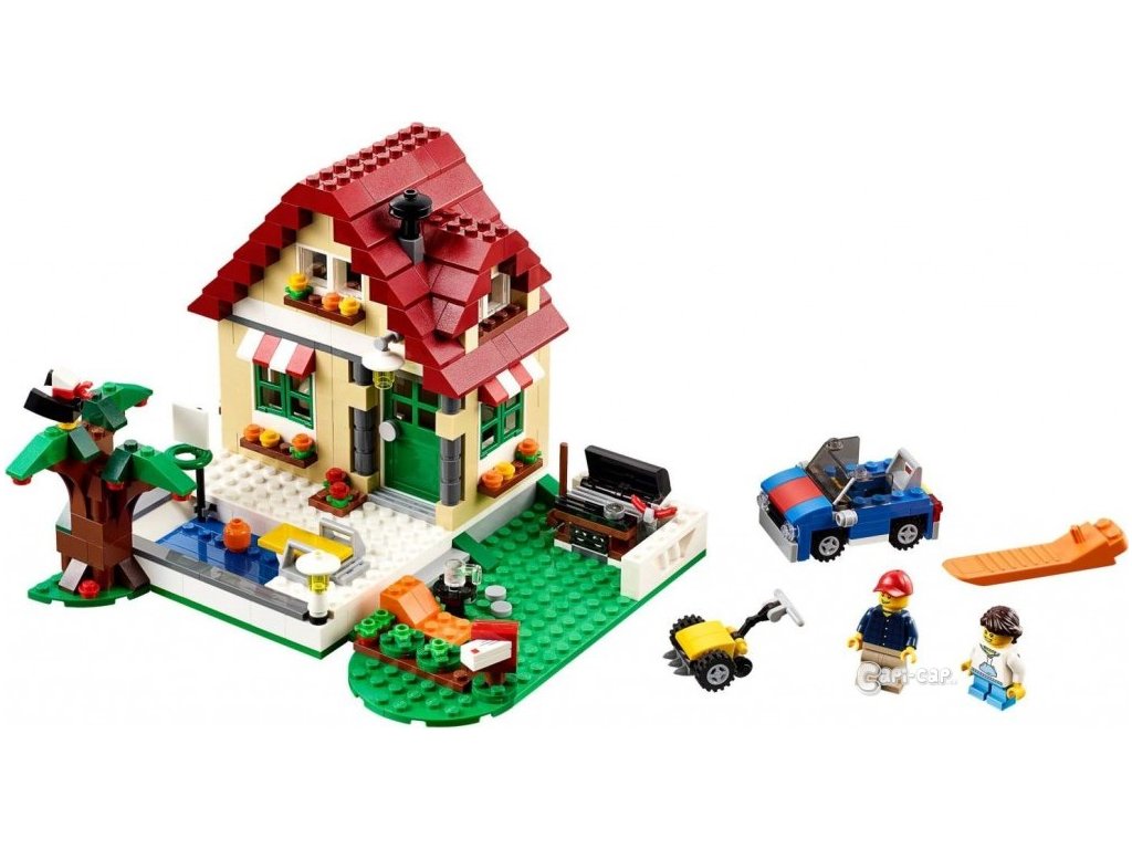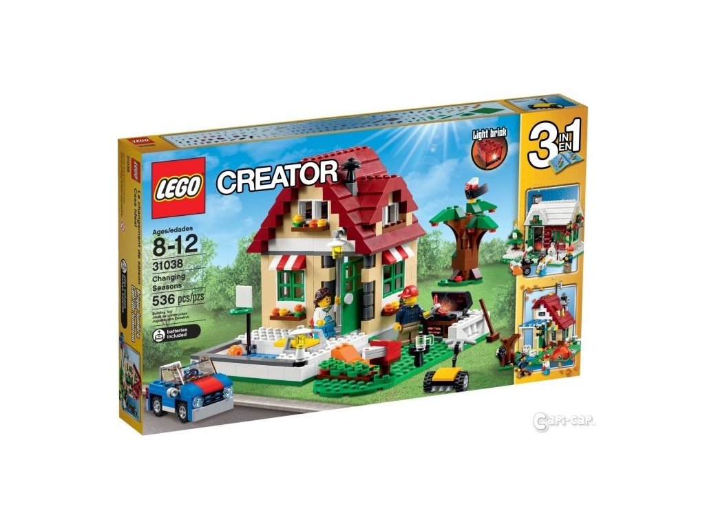 Užij si radosti léta, podzimu nebo zimy s úžasnou stavebnicí 3 v 1 LEGO Creator Změny ročních období! Vítej do okouzlující letní chaty s tmavě červenými taškami na střeše, zelenými předními dveřmi, červenobílými markýzami a barevnými květináči v oknech. Venku sedí ve vysokých větvích jabloně pták a modré auto září v jasném slunečním světle, které rozzařuje krásnou zahradu s trávníkem, zahrádkou a bazénem. Tento model s krásnými detaily také obsahuje poštovní schránku, sekačku, pohovku a stůl. Osvětli grilovačku pomocí svítící kostky nebo rozlož chatu a tím odkryj detailní vnitřek se stolem, lampou, židlí a žebříkem. Pokud chceš změnit roční období, přestav chatu na podzimní domek s halloweenskou tématikou nebo na zimní chatu s vánoční tématikou. Obsahuje 2 minifigurky s různými doplňky: dospělého a dítě.