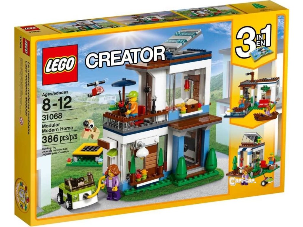 Vytvoř si jednoduše krásný moderní dům 3 v 1. Sada obsahuje svěží bílé, hnědé a světle modré barevné schéma, velká okna, solární střešní okno, balkon se slunečníkem a detailní vzdušný interiér s ložnicí v patře a přízemním pokojem s pohovkou a křeslem. Užij si zábavu na trampolíně, vezmi na procházku roztomilého pejska nebo si dobij elektroauto a vyraz na projížďku. Snadno kombinuj jednotlivé oddělitelné části a upravuj si tak svůj dům - prohoď okna a dveře nebo si třeba postav střešní terasu - je to jen na tobě! Můžeš dokonce přestavět tuto sadu LEGO® Creator na parádní Bydlení u jezera nebo na Zahradní bydlení.