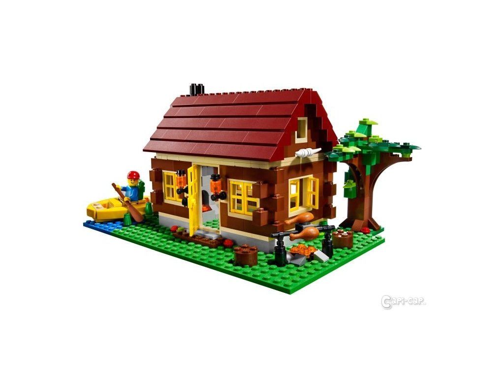 Tento srub je ideální základnou pro dobrodružství v divočině. Jsou tu skvělé detaily jako otevřené ohniště, kde lze opékat kuřata, špalky na sezení, strom a otevírací dveře a okna. Součástí sady je minifigurka s batohem, kánoe a pádlo. Lze přestavět na venkovskou chalupu či rybářský domek.