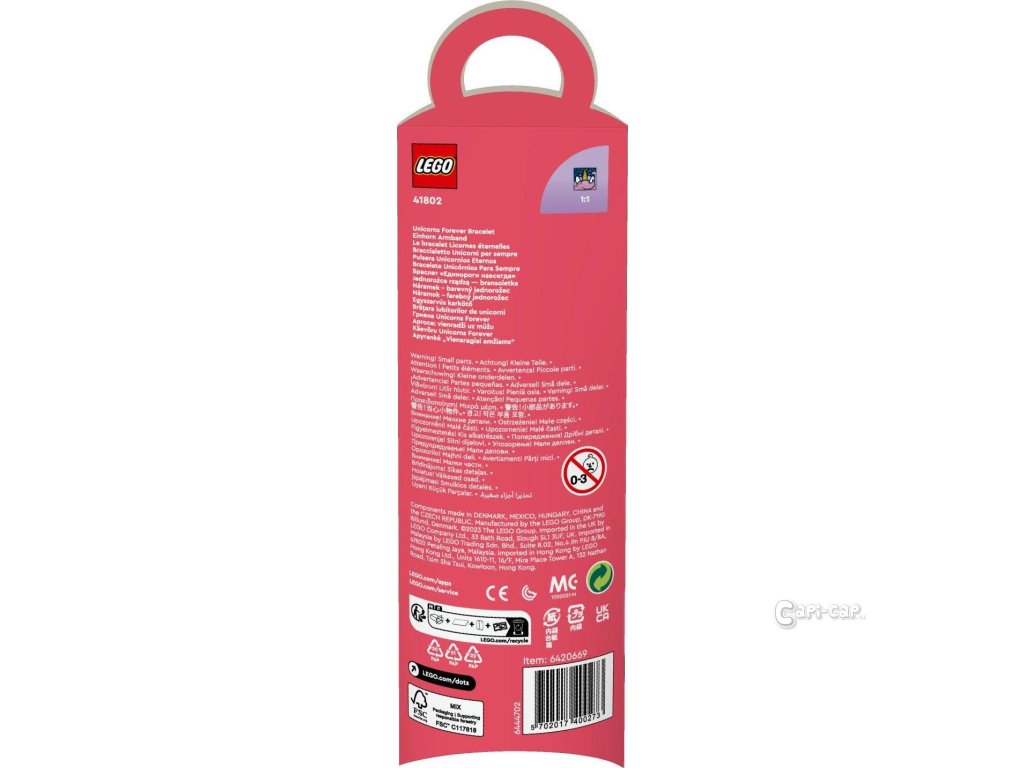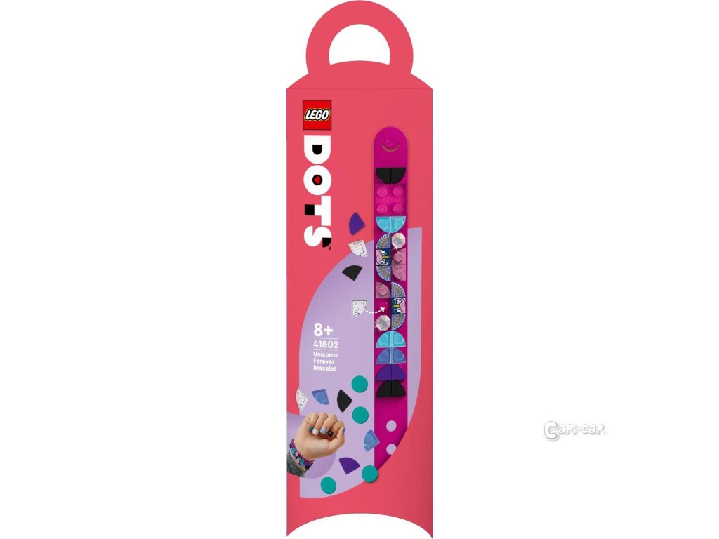 • Vytvářejte, noste, sdílejte – Inspirujte milovníky jednorožců stavebnicí Náramek – barevný jednorožec (41802) od LEGO® DOTS, která přináší spoustu nápadité zábavy. Hraní začíná ihned po vybalení • Vytváření a přetváření – Děti mohou prozkoumávat a rozšiřovat své dovednosti. K dispozici je nastavitelný náramek v magentové barvě, a k tomu navíc 36 dílků, včetně zdobítek s jednorožcem a „diamantových“ dílků • Originalita v sáčku – Tato stavebnice nabízí rychlé, nápadité aktivity. Kromě toho mohou děti své výtvory rozšířit pomocí stavebnice 41803 DOTS doplňky – 8. série – Třpytky (prodává se samostatně) • Zábavný dárek pro kutily od 8 let – Tuto stavebnici s nepřebernými možnostmi přizpůsobení si jistě zamilují všichni příznivci ručních prací a designu. Robustní náramek a široká řada zdobítek poslouží jako překvapivý dárek • Malé a přenosné – Náramek měří přes 20 cm na délku, takže dětem nabízí dostatek prostoru, aby mohly projevit svou kreativitu a kdekoli a kdykoli si jej přezdobit podle sebe • Do jakých výzev se malí designéři pustí? – Díky jednoduchým nápadům na obalu nebude o inspiraci nouze, takže se děti mohou pustit do zdobení a experimentů bez zbytečných průtahů • Svoboda při navrhování a rozvoj sebevědomí – Tato stavebnice od LEGO® DOTS otevírá brány do světa kreativity. Připravený náramek je možné začít okamžitě zdobit a zároveň se jedná o skvělou příležitost, jak pomocí hraní podpořit dětské sebevědomí • Neomezené možnosti hraní a sebevyjádření – Modely od LEGO® DOTS přinášejí dětem radost ze stavebnic LEGO. Vybízejí je k tomu, aby se projevily tvorbou a zdobením vlastních šperků, doplňků nebo bytových dekorací • Kvalita bez kompromisů – Už od roku 1958 splňují dílky LEGO® přísné standardy a umožňují konzistentní spojování • Bezpečnost na prvním místě – Dílky LEGO® pouštíme na zem, zahříváme, drtíme, kroutíme a analyzujeme, abychom zajistili, že vyhovují přísným globálním bezpečnostním standardům