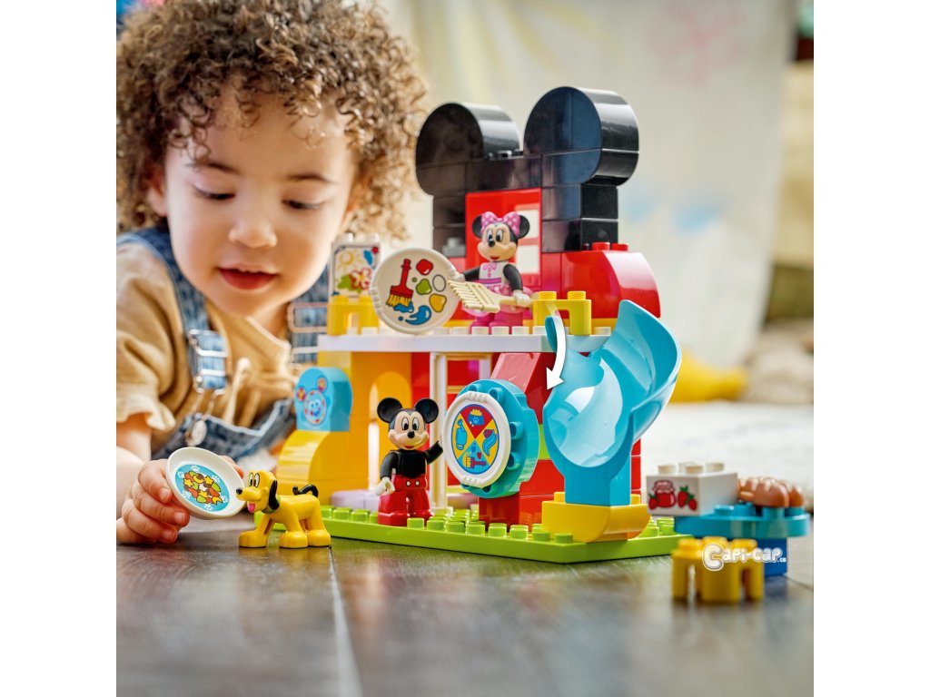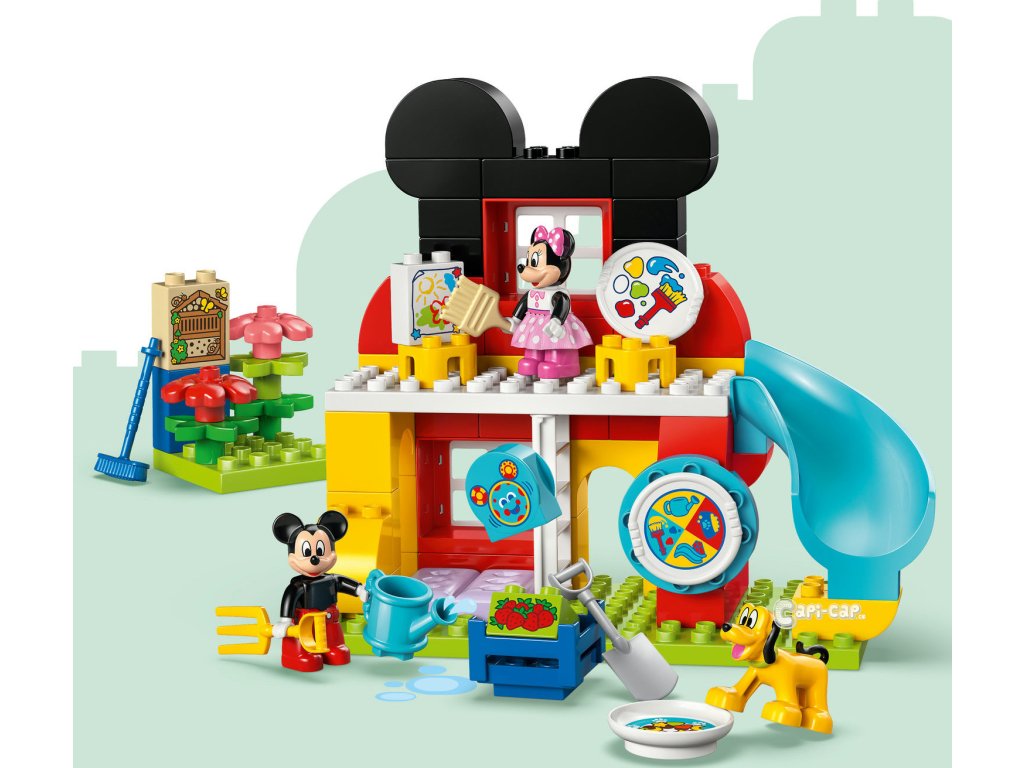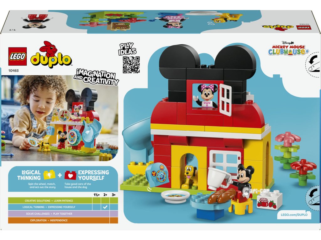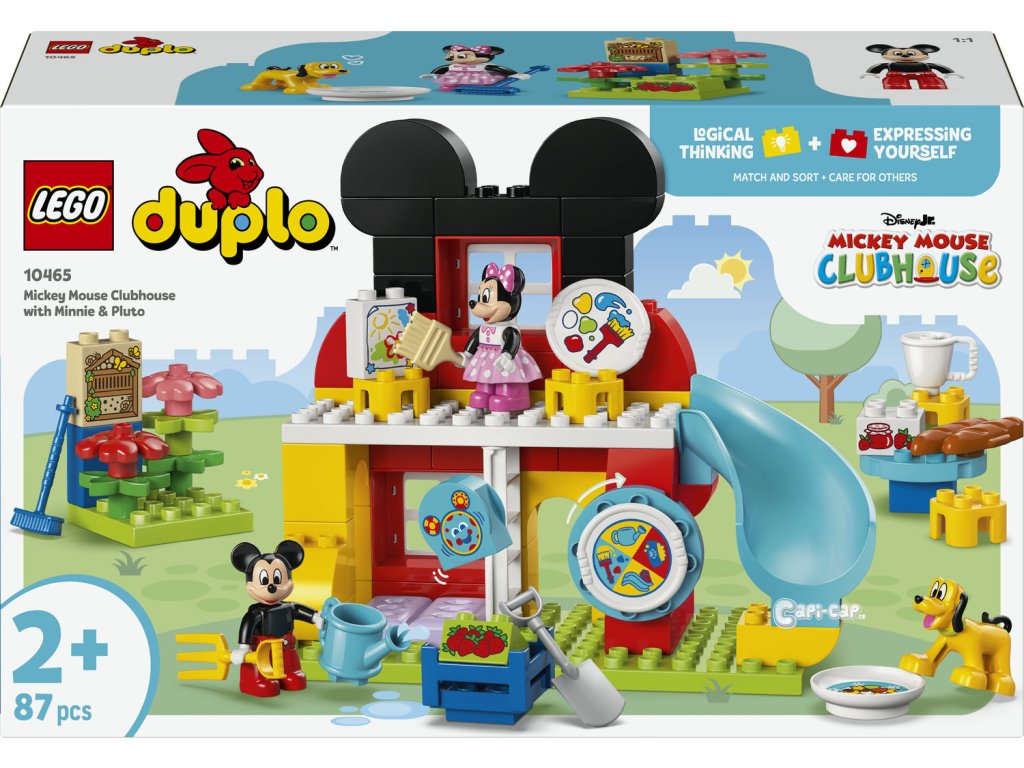 Děti od 2 let se připojí k oblíbeným postavičkám ze světa Disney a pustí se do plnění zábavných úkolů se stavebnicí Mickeyho klubík, Minnie a Pluto (10465). Stavebnice obsahuje dvoupatrový dům se skluzavkou, výtvarnou dílnou, zahradou s hotelem pro hmyz, stoly, židle a speciální dveře pro Pluta. Nechybí postavičky LEGO ǀ Disney Mickey Mouse, Minnie Mouse a Pluto a kostka s motivem počítače Ouška. Děti odstartují hru roztočením Myškostrojíku, který rozhodne, jestli postavičky dostanou za úkol nakrmit Pluta, kopat na zahradě, malovat obrázek nebo si hrát na skluzavce. Nebo se pustí do hraní podle vlastní fantazie a objeví všechny možnosti stavebnice. Můžou pěstovat jahody nebo připravit marmeládu k snídani. Tato stavebnice Disney jim pomůže procvičit jemné motorické dovednosti při umisťování nářadí do rukou postaviček. Vzdělávací stavebnice pro nejmenší umožní klukům a holkám pečovat o druhé, během hry na krmení Pluta nebo přípravy snídaně pro své kamarády. Stavebnice obsahuje 87 dílků.