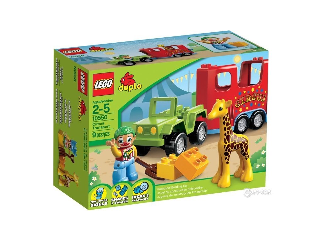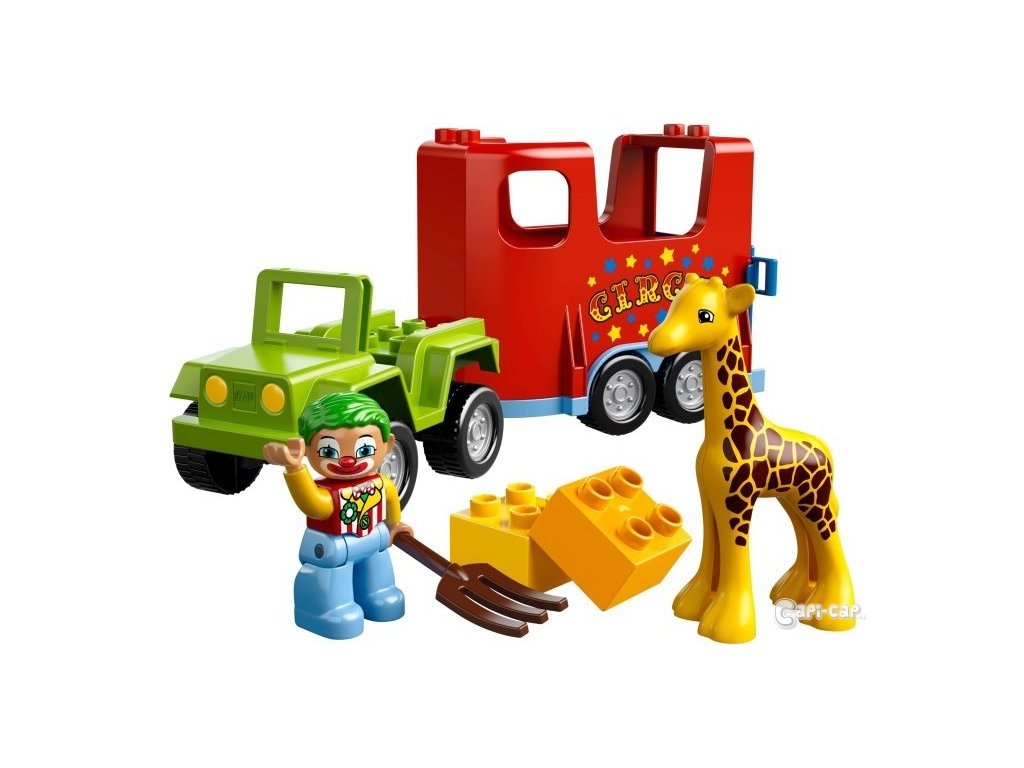 Vydej se do světa s cirkusem! Pomoz klaunovi naložit na cirkusový transportér s pomalovaným přívěsem malou žirafku a vydejte se na cestu! Nakrm zvířátka vidlemi a postav si něco z LEGO DUPLO kostek! Obsahuje DUPLO figurku klauna.