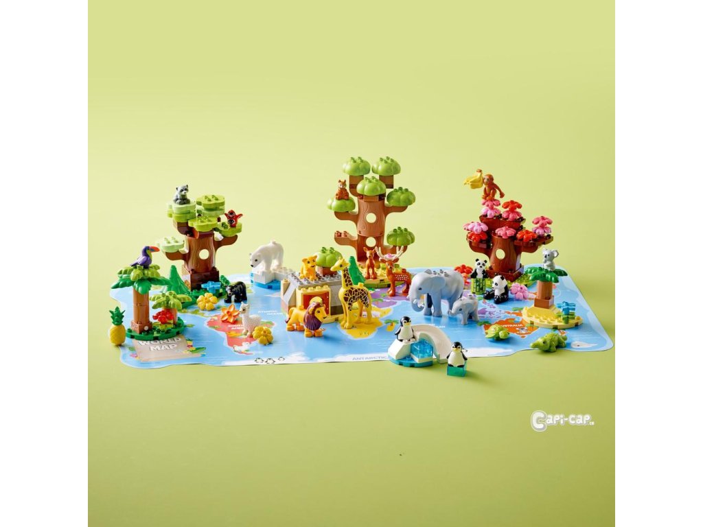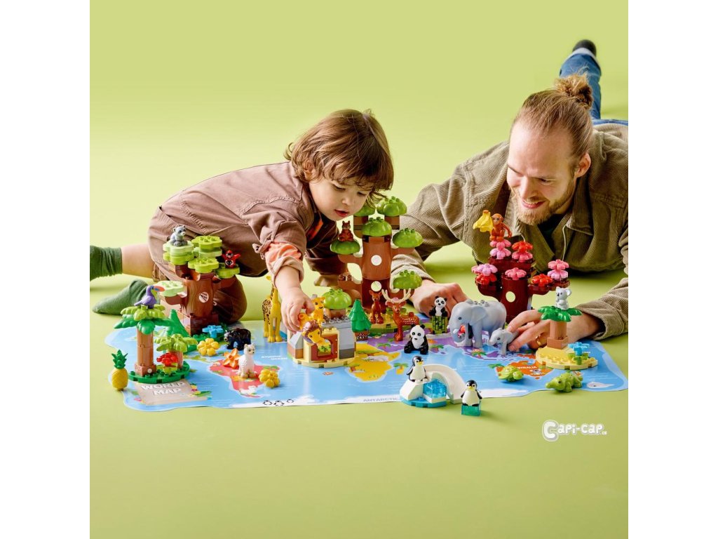 Stavebnice Divoká zvířata světa (10975) od LEGO® DUPLO® je nabitá zvířaty v přirozených prostředích. Nechybí ani spousta autentických detailů a příležitostí, které dětem od 2 let umožní dozvědět se hravou formou něco nového. Postavte a prozkoumejte divokou přírodu z celého světa Vezměte svého předškoláka na výpravu do divočiny a udělejte si zastávku na každém ze 7 světadílů! Objevte asijské pandy, africké lvy, evropské jeleny, jihoamerickou lamu, severoamerického medvěda, australskou koalu, antarktické tučňáky… a spoustu dalších živočichů! Tento divoký dárek pro malé milovníky přírody potěší zvukovou kostkou, která přehrává zvířecí a přírodní zvuky, ale také skládací herní podložkou s mapou světa. Učení hrou pro malé děti Všechny stavebnice LEGO DUPLO byly odborníky navrženy tak, aby obsahovaly zábavné příběhy, pestré barvy, rozmanité postavy a celou řadu detailů, které vašemu dítěti pomůžou udělat VELKÝ první krok na cestu životem.