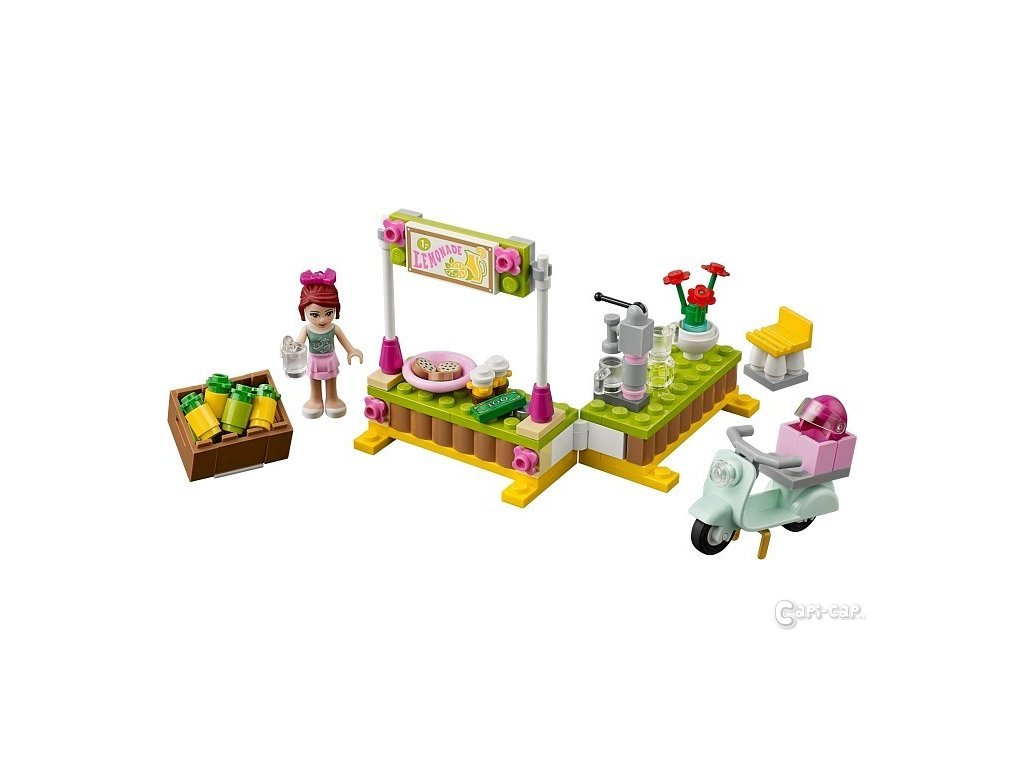 Vítej u stánku s limonádou Mii! Zavez ji do stánku na peprmintově zeleném skútru a otevřete si stánek pro své kamarádky. Vylož sušenky a pomoz jí připravit osvěžující limonádu. Limonádu připravíš v odšťavňovači a poté už jen servíruješ! Mia se rozhodla věnovat svůj výdělek na charitu, takže doufá, že přijde hodně zákazníků! Obsahuje minifigurku-panenku Mii a různé doplňky.