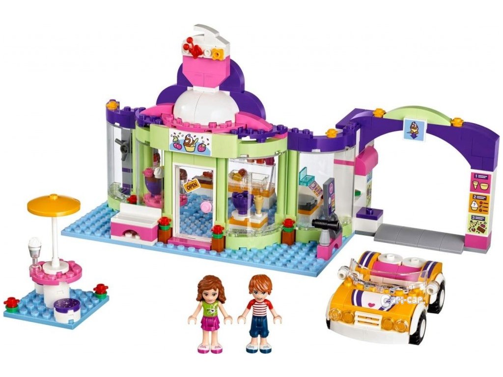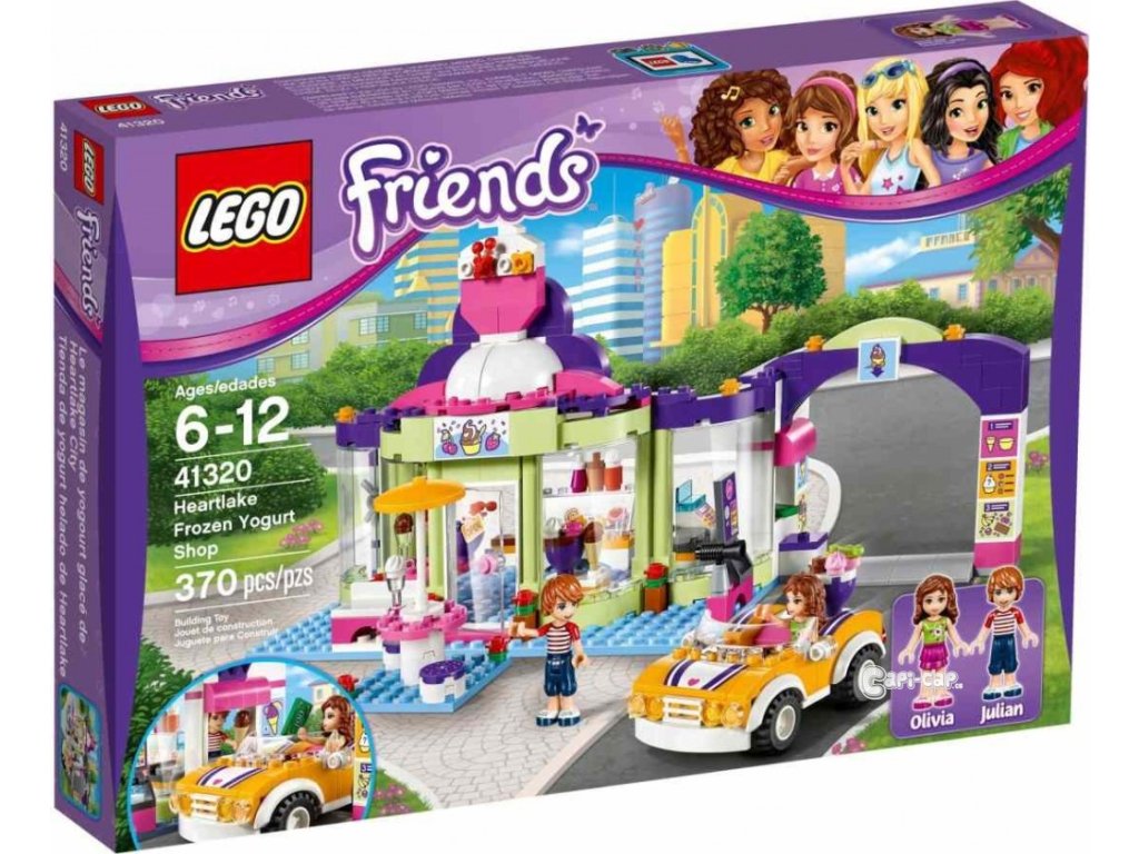 Obchod s mraženými jogurty v Heartlake od LEGO® Friends obsahuje stroj na mražené jogurty s funkcí samoobsluhy, bar s nejrůznějšími polevami, dále váhy, telefon na objednávky, vnitřní posezení a venkovní stůl se slunečníkem. Součástí je také obslužná linka pro auta s objednávkovým stanovištěm a parádní žluté auto s prostorem pro uložení tvého mraženého jogurtu v zadní části. Součástí jsou dvě minifigurky - panenky.