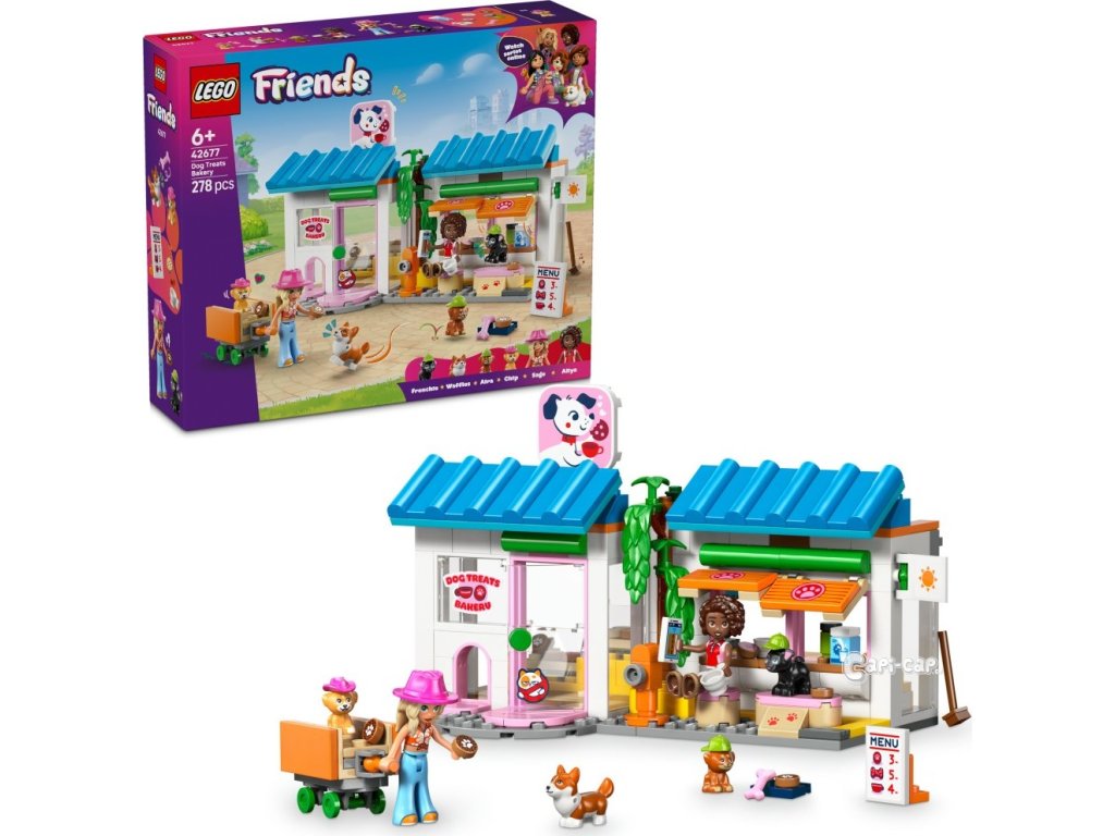 LEGO® 42677 Friends Pekárna pamlsků pro pejsky představuje stavebnici určenou dětem od 6 let, která umožňuje zábavnou a kreativní hru s tématem péče o domácí mazlíčky. Model pekárny je vyveden v jasných barvách, převážně bílé s modrou střechou a oranžovými detaily, což dodává celé scéně hravý a přívětivý vzhled. Stavba obsahuje dvě minipanenky a čtyři pejsánky, z nichž někteří mají na hlavách malé zelené čepice, což podtrhuje jejich roli v příběhu pekárny. Součástí pekárny je vstupní část s otočnými dveřmi pro pejsky, pult s výlohou, kde jsou vystaveny pamlsky, a také venkovní posezení.