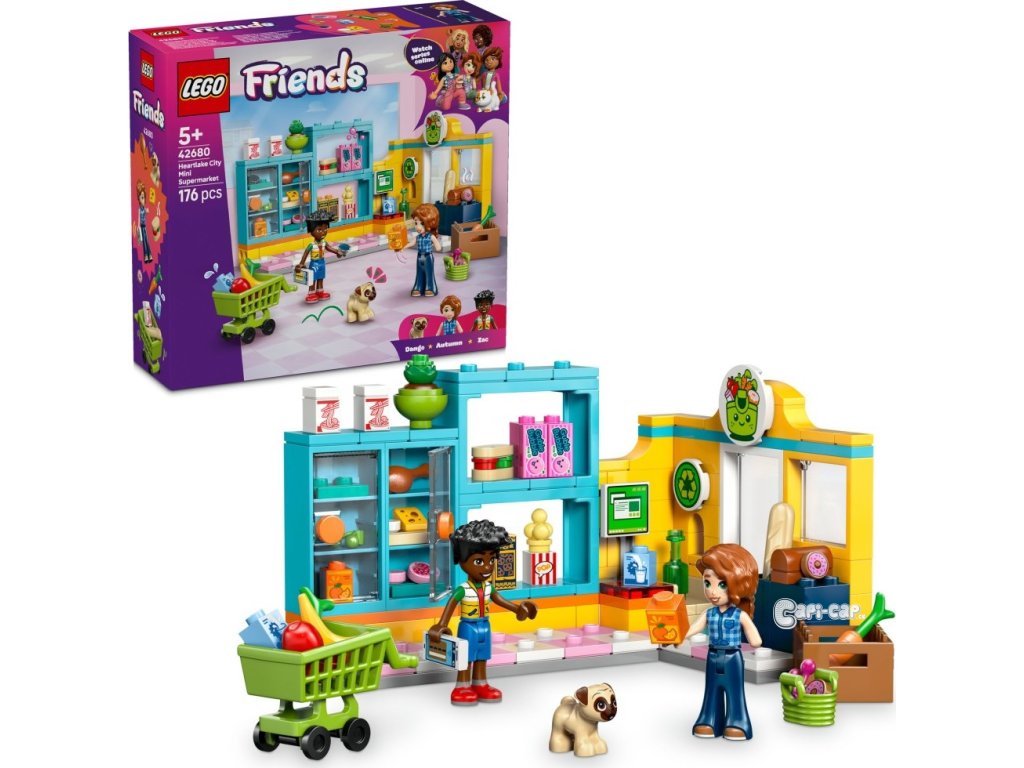LEGO® 42680 Friends Samoobsluha v městečku Heartlake je stavebnice určená pro děti od pěti let, která přináší zábavu při hře na nakupování v obchodě s potravinami. Tento model obsahuje 176 dílků a umožňuje sestavit barevný malý supermarket s výraznou žluto-modrou fasádou, která je doplněná o vitríny na potraviny a regály plné různorodých produktů. Vnitřní prostor je vybaven pokladnou, nákupním vozíkem, košíkem a recyklačním stanovištěm, což napomáhá k realistickému zážitku ze hry.