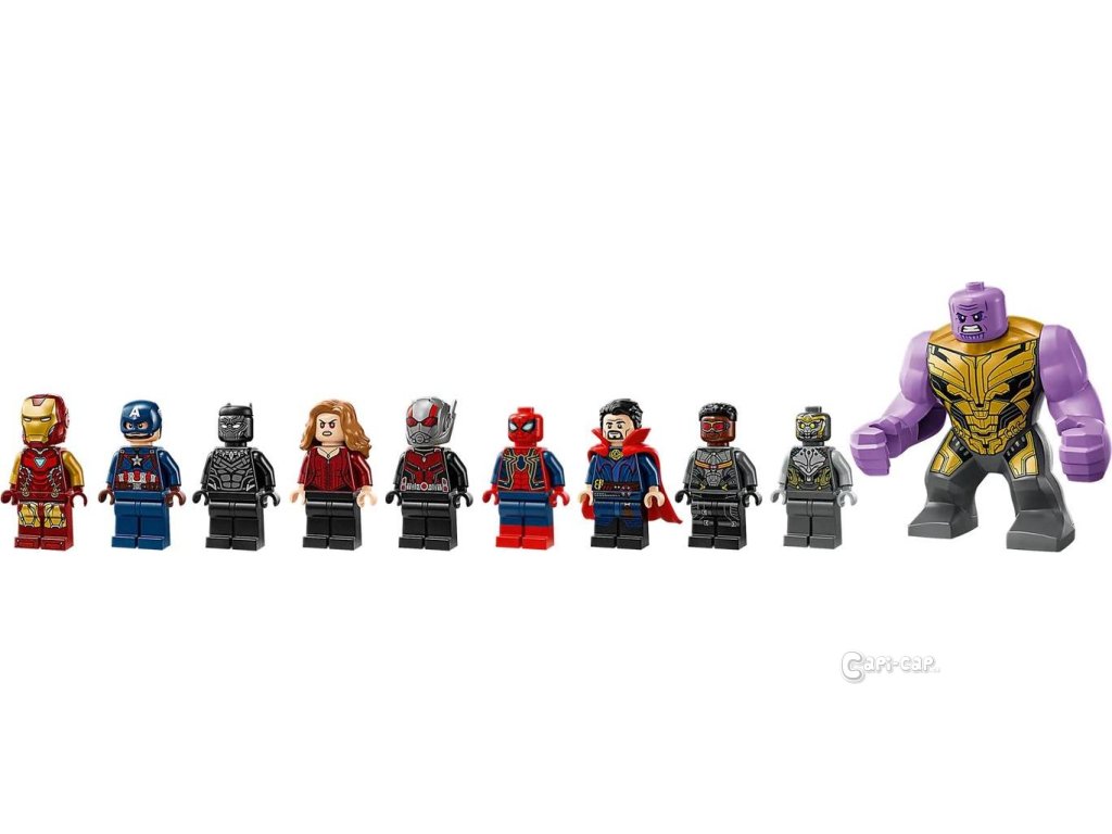 Figurky LEGO® Avengers – Minifigurky Kapitána Ameriky, Black Panthera, Iron Mana, Scarlet Witch, Ant-Mana, Iron Spidera, Doctora Strange, Falcona a Chitauriho a figurka Thanose a robotický oblek Ant-Mana