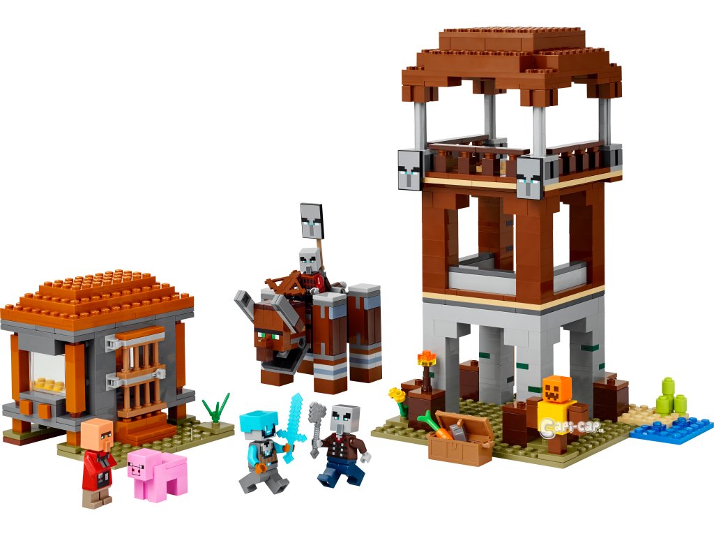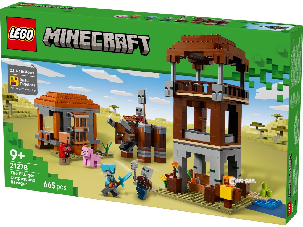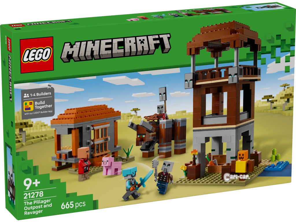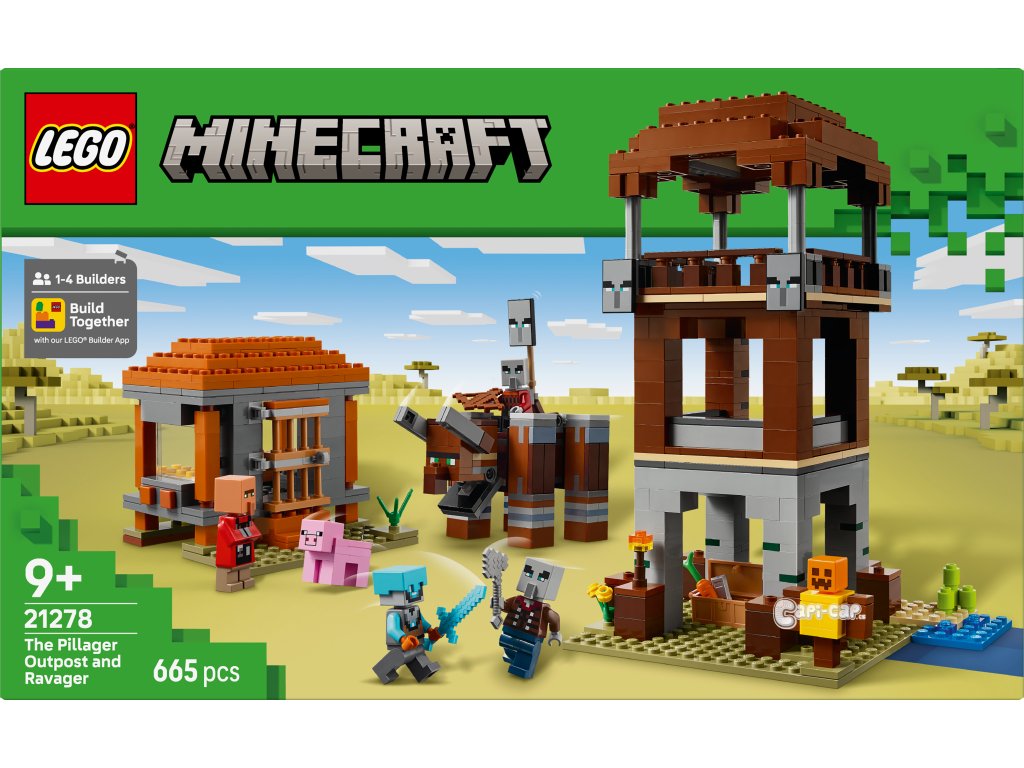 Stavebnice Základna plenitelů a Ničitel (21278) představuje kreativní videoherní dárek pro děti, které mají rády stavebnice, dobrodružství LEGO® Minecraft a dekorace do pokojíčku. S touto kvalitní hračkou si děti od 9 let užijí velkou porci zábavy ze světa Minecraftu. Stavebnice obsahuje 4 minifigurky LEGO Minecraft: vesmírného strážce, kapitána nájezdu, vesničana zedníka a mstitele. Sestavitelná figurka Ničitele má funkci ovládanou pákou, která dětem umožňuje provádět pohyby, při kterých figurka práská čelistí a naráží hlavou. Strážní věž obsahuje žebříky, které umožňují přístup do tří pater, prapory s tvářemi plenitelů a truhlu s drahocennou kořistí. Dům zedníka má otevírací dveře a zařízený interiér s postelí a řezačkou kamení. Součástí je také figurka prasete LEGO Minecraft a doplňky včetně cvičné figuríny, pochodně, mrkve, železného ingotu, diamantové helmy, diamantového meče, kuše a železné sekery. S aplikací LEGO Builder si děti užijí ještě větší porci zábavy a umožní jim na zařízení přibližovat a otáčet modely ve 3D. Součástí je 665 dílků.