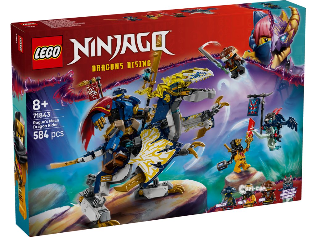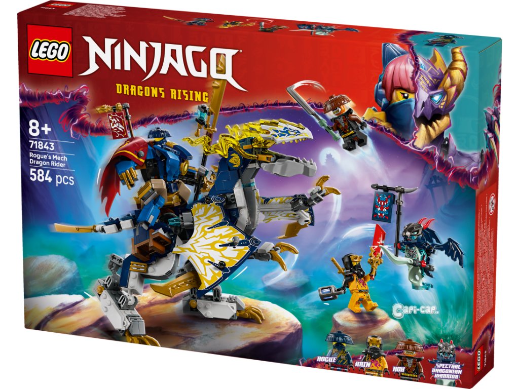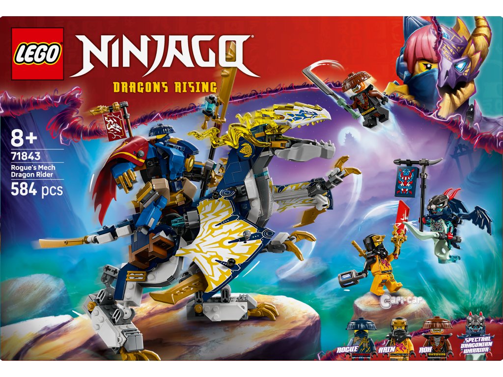 S kombinovanou nindžovskou stavebnicí Rogue a robotický dračí jezdec (71843) si kluci a holky od 8 let připomenou příběhy z 3. řady televizního seriálu NINJAGO® Dračí povstání. Děti si můžou hrát s robotem nebo vůbec prvním robotickým drakem NINJAGO, které pak spojí do úžasného modelu Rogue a robotický dračí jezdec. Robotická figurka má pohyblivé ruce a nohy, otevírací hruď, do které lze umístit minifigurku, a meč. Figurka draka má pohyblivá křídla, hlavu, čelist, nohy a ocas a meč. Součástí stavebnice jsou 4 minifigurky: Nindža válečníci Rogue a Arin a zlotřilá dvojice Rox a Přízračný dračí bojovník, kteří mají vlajku s tajnou zprávou, kterou lze přečíst pouze pomocí Arinovy odhalující čepele. Děti můžou na zadní stranu figurky draka z této stavebnice připevnit roboty ze stavebnic Kaiův bouřný jezdec a robot (71830) a Kaiova robomotorka EVO (71783) (prodávají se samostatně). Tuto stavebnici lze také postavit s pomocí aplikace LEGO® Builder, která vás a vaše dítě provede stavitelským dobrodružstvím. Stavebnice obsahuje 584 dílků.