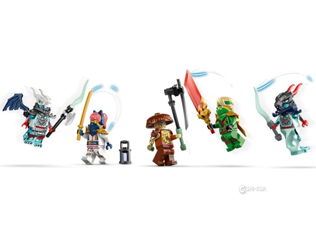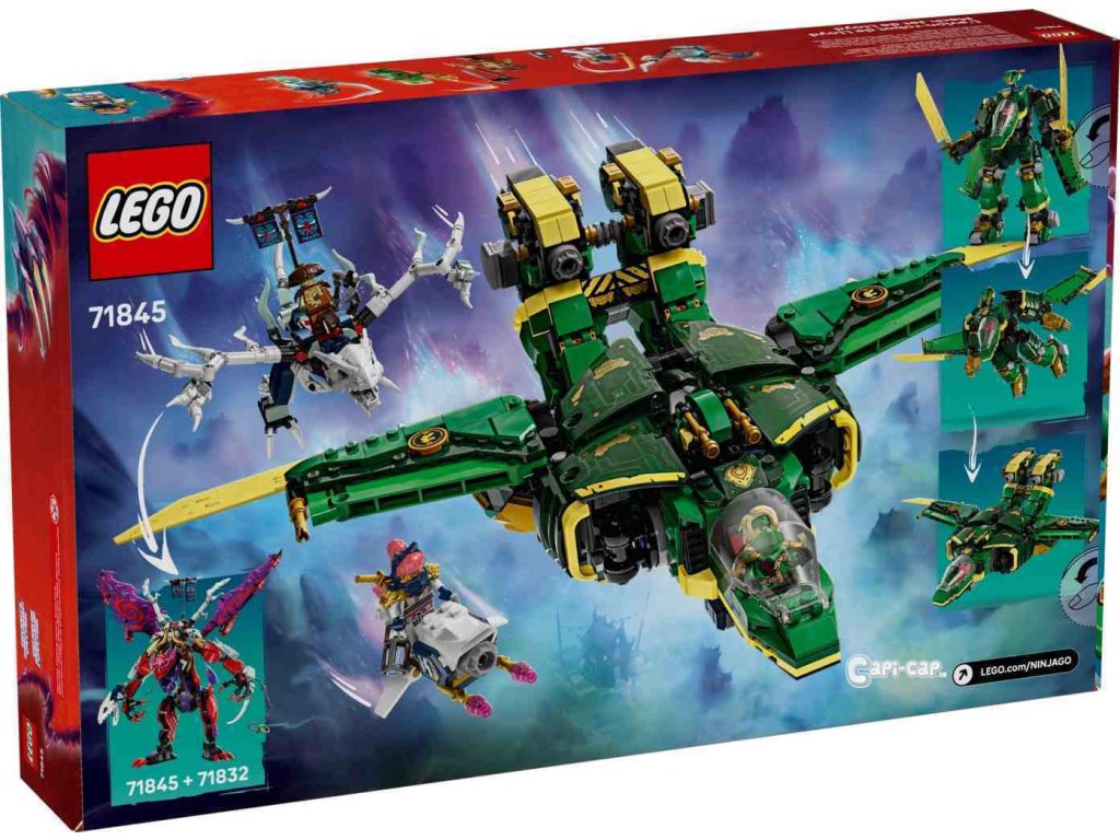 Děti od 9 let si se stavebnicí Lloydův robotický tryskáč (71845) užijí nindžovská dobrodružství, bitvy ve vzduchu i na zemi a připomenou si akční scény ze 3. řady televizního seriálu NINJAGO® Dračí povstání. Děti si s užijí akční hraní s touto působivou bitevní stavebnicí robota, který má pohyblivé nohy a ruce, kokpit a 2 velké meče. Poté můžou přeskládat jeho robotické části na parádní model tryskáče s kokpitem, křídly a tryskovými motory. Tato dobrodružná bitevní stavebnice obsahuje 5 minifigurek: Soru a Lloyda vyzbrojené nindžovskými zbraněmi, aby se mohli postavit zlotřilé Kur, Tyrovi a Přízračnému dračímu bojovníkovi, kteří mají prapor s tajnou zprávou, kterou lze přečíst pouze pomocí Lloydovy průsvitné odhalující čepele. Sora má k dispozici létající motorku a padouši mají pohyblivého přízračného draka, kterého lze kombinovat s dílky ze stavebnice Drak chaosu Thunderfang (71832) (prodává se samostatně). Stavebnice se skládá z 1112 dílků.