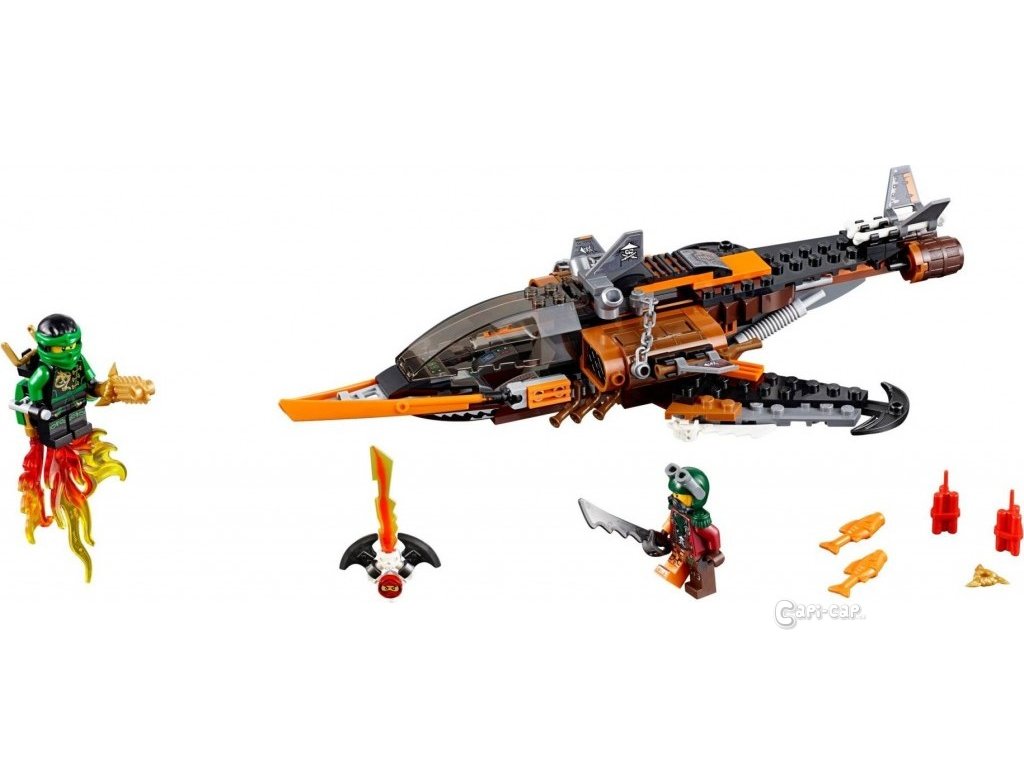 Vyšli drona, aby zjistil více o této úžasné stíhačce s nebezpečnými čepelemi, puškami a spoustou skvělých pirátských detailů. A dej pozor - žraločí letoun by každou chvíli mohl shodit dynamit nebo zkažené ryby! Potom předělej drona na trysky pro Lloyda a leť s nindža hrdinou do boje. Sestřel žraločí letoun a bojuj, abys osvobodil Kai, který je uvězněn džinovou čepelí!
