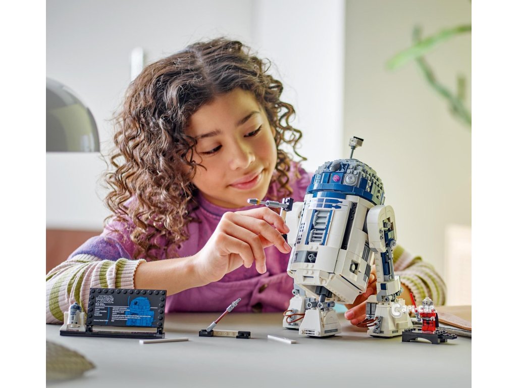 • Sestavitelná figurka LEGO® Star Wars™ R2-D2 – Postavte si z kostek LEGO hravý výstavní model jedné z nejoblíbenějších postav ve světě Star Wars • Sestavitelný výstavní model s hravými detaily – Hlavu R2-D2 lze otáčet o 360 stupňů a součástí je také třetí noha pro pohyb, odnímatelný periskop a nástroje • Figurka LEGO® R2-D2 a minifigurka LEGO Star Wars™ – Součástí hlavního modelu je figurka LEGO R2-D2 a nechybí minifigurka Dartha Malaka k oslavě 25. výročí LEGO Star Wars • Zábavný výstavní kousek – Model doplňuje informační cedulka o R2-D2 a podstavec pro minifigurku Dartha Malaka zdobený logem 25. výročí LEGO® Star Wars™ • Tip na dárek pro fanoušky Star Wars™ od 10 let – Tato sběratelská stavebnice LEGO® potěší každého malého fanouška Star Wars a sběratele Star Wars • Interaktivní digitální stavění – Aplikace LEGO® Builder s návody na stavění dětem umožňuje přibližovat, otáčet a vizualizovat si digitální verzi modelu, zatímco na něm pracují, ukládat postup stavění a spoustu dalšího • Stavebnice LEGO® Star Wars™ pro všechny věkové kategorie – Stavebnice LEGO Star Wars umožňují dětem a dospělým fanouškům přehrávat si slavné scény, vymýšlet vlastní kreativní příběhy a vystavovat si sestavitelné modely • Stavějte, hrajte si a vystavujte – Stavebnice droida R2-D2 z kostek LEGO® se skládá z 1 050 dílků a model měří přes 24 cm na výšku, 16 cm na šířku a 11 cm do hloubky