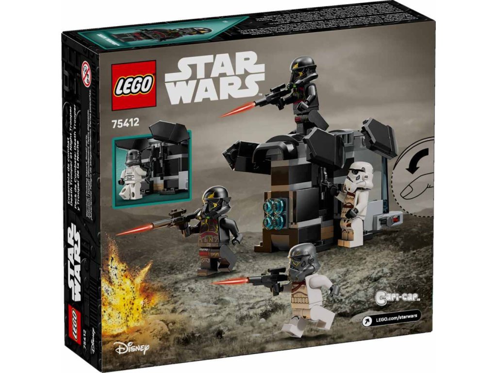 Děti si postaví vlastní četu a vydají se s ní do bitev ze seriálu LEGO® Star Wars: Ahsoka™ s Bitevním balíčkem: Death Trooper a Night Trooper (75412). Stavebnice představuje parádní malý dárek pro kluky, holky a fanoušky od 6 let, který obsahuje výsadkovou loď s prostorem pro 4 minifigurky LEGO na zadní straně, 2 vystřelovači a kokpitem s odnímatelným krytem pro minifigurku LEGO. Součástí jsou 4 minifigurky LEGO Star Wars™ – 2 Death Troopeři a 2 Night Troopeři. Každý z nich má blaster, který můžete umístit vedle nich v zadní části výsadkové lodi. Připravte se na zábavné bitvy! Nenechte si ujít další Bitevní balíčky LEGO Star Wars (prodávají se samostatně) a objevte další minifigurky, vozidla a doplňky LEGO, se kterými si děti užijí ještě více možností fantastického hraní. Stavebnice obsahuje 119 dílků.