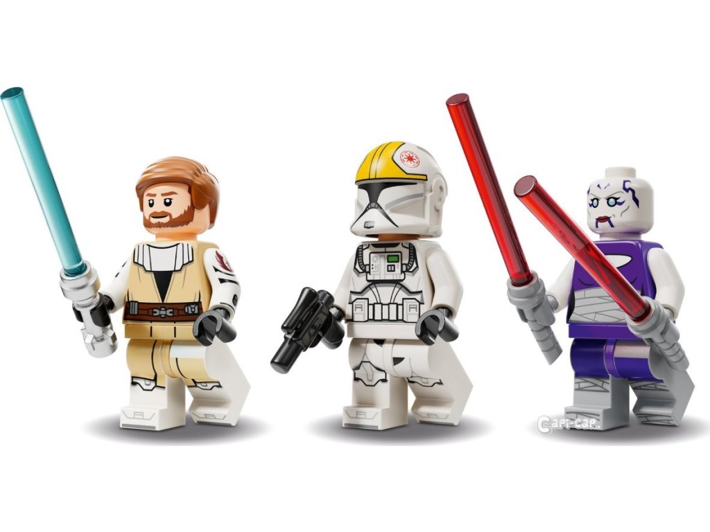 3 minifigurky LEGO® Star Wars™ – Asajj Ventress se 2 červenými světelnými meči se zahnutými jílci, generál Obi-Wan Kenobi s modrým světelným mečem a klonovaný pilot s blasterovou pistolí