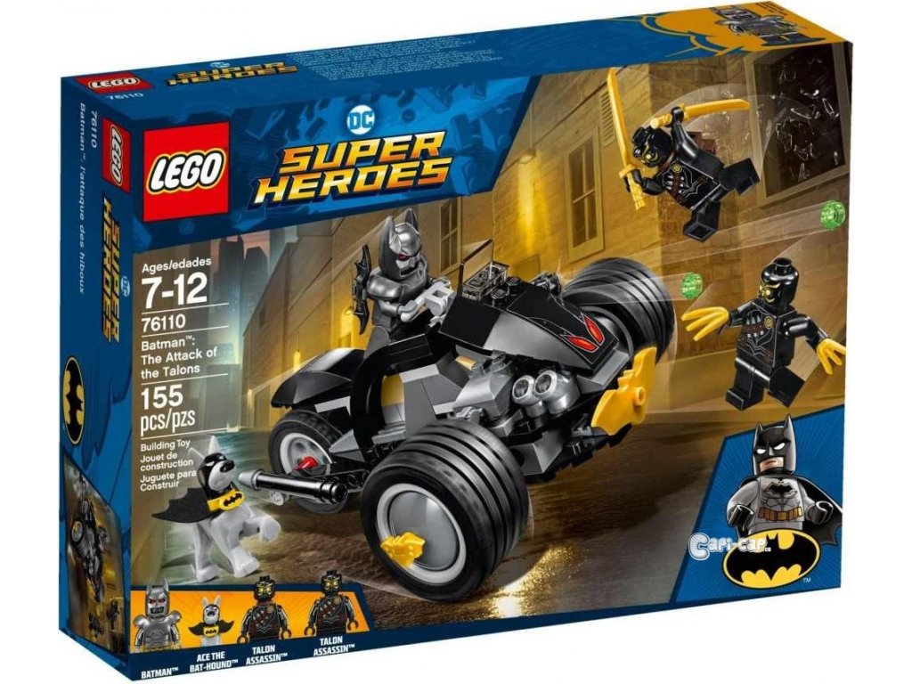 Spoj své síly s Batmanem a jeho psím společníkem Acem a přemozte společně nájemné vrahy Talony v sadě 76110 Batman™: Útok Talonů, která obsahuje Batmanovu motorku s dvojitým vystřelovačem a přípojnými body pro nejrůznější zbraně a dílky, které jsou součástí balení. Tato sada obsahuje 3 minifigurky s různými zbraněmi pro ještě větší zážitek z boje.