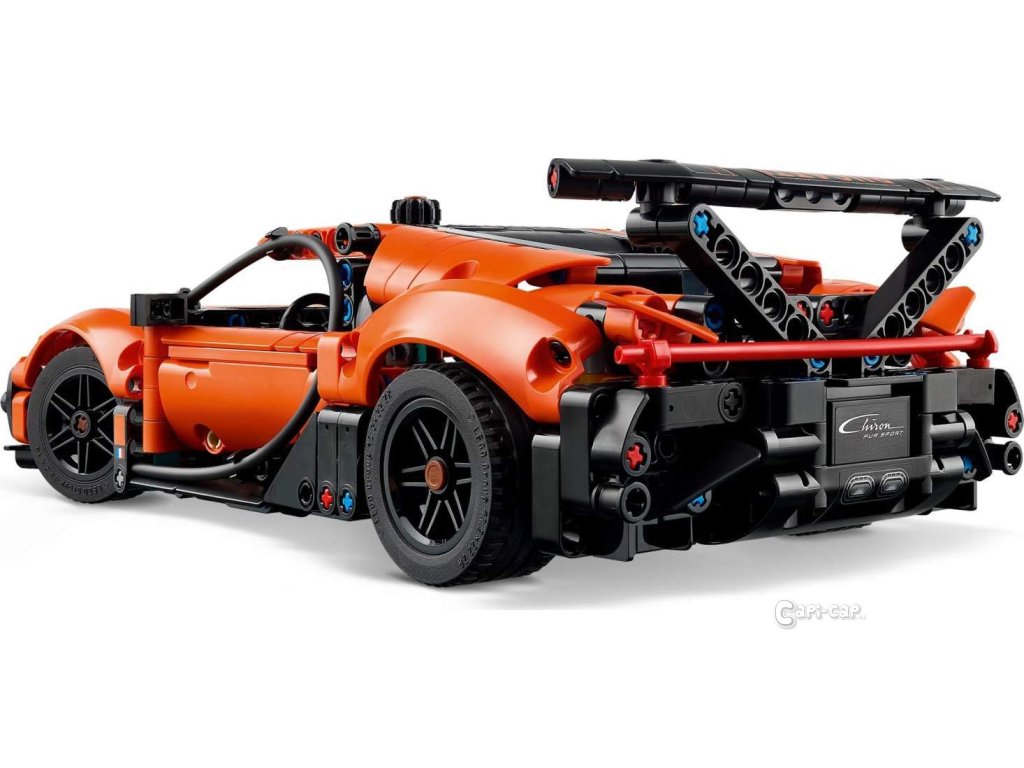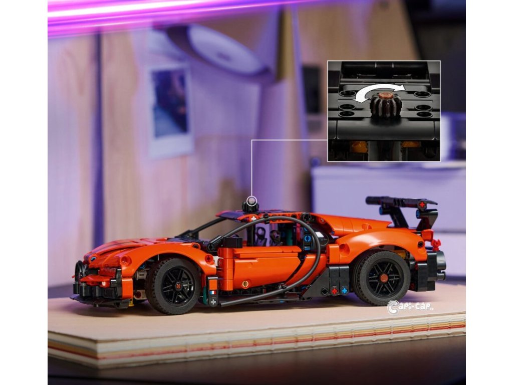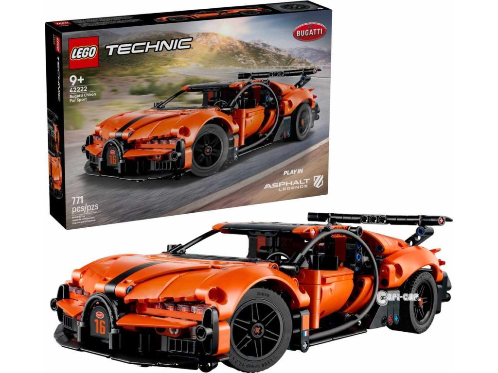 LEGO® Technic Hyperauto Bugatti Chiron Pur Sport (42222) je detailně zpracovaný model sportovního vozu určený dětem od 9 let a všem fanouškům motosportu. Stavebnice obsahuje celkem 771 dílků, které umožňují sestavit věrnou repliku ikonického vozu Bugatti Chiron Pur Sport v nápadité oranžovo-černé barevné kombinaci. Model je opatřen výrazným černým pruhem přes kapotu a střechu, který zdůrazňuje jeho sportovní charakter, a obsahuje realistické detaily, jako jsou aerodynamické prvky, velké černé disky kol s nízkoprofilovými pneumatikami a výrazné zadní křídlo.