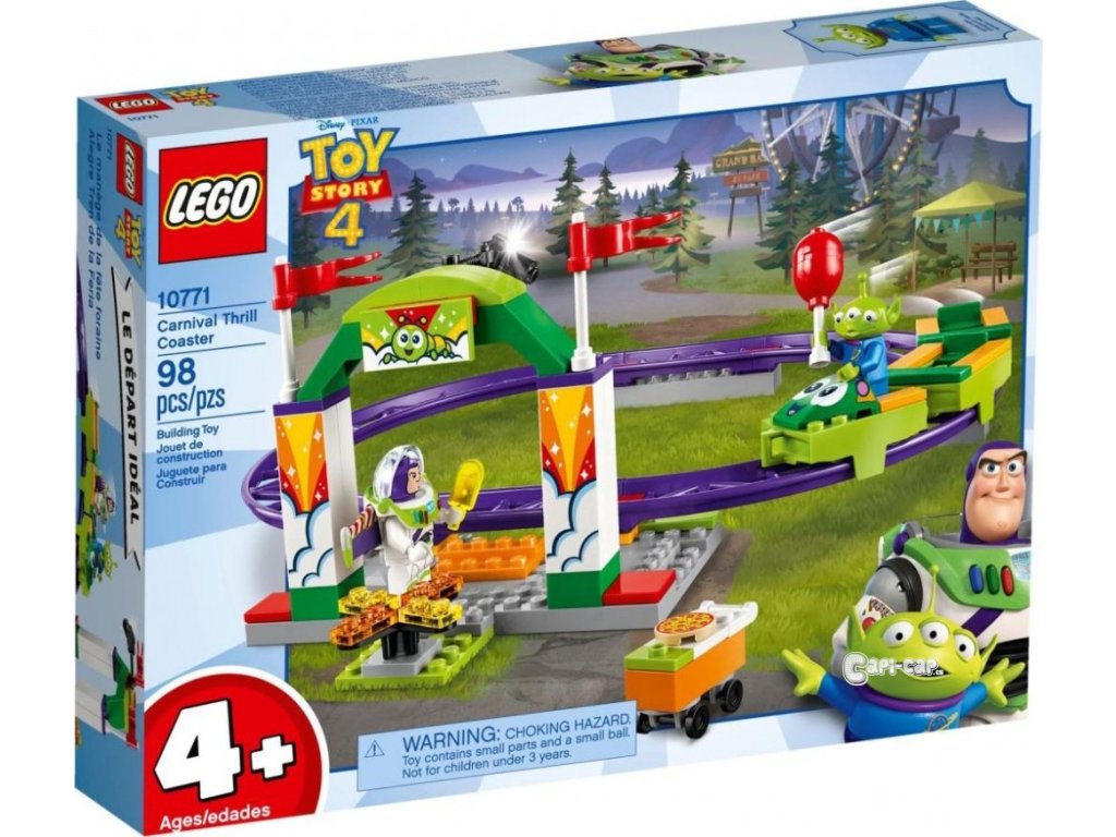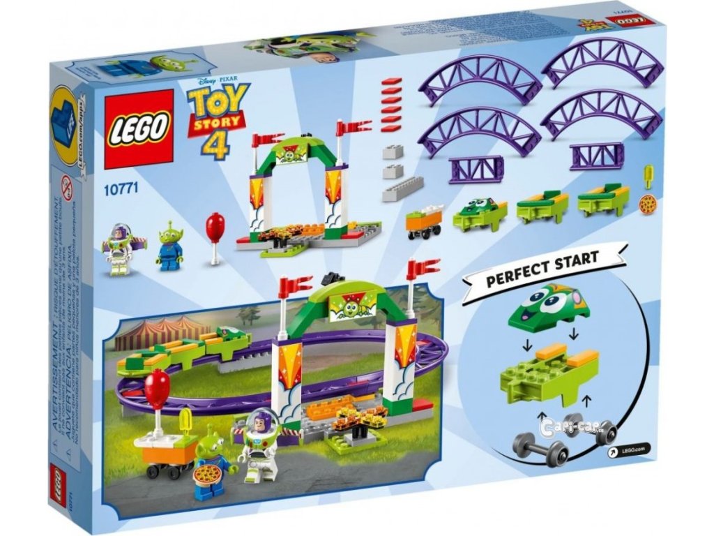 Tato akční stavebnice je speciálně navržena tak, aby byla zábavná a snadná pro děti v předškolním věku a menší děti. Tato skvělá sada obsahuje barevnou karnevalovou horskou dráhu se 3 auty, 6 mohutnými kusy kolejí a velkým vstupním obloukem s otáčecím turniketem, a k tomu navíc speciální začátečnickou podložku, která umožní i těm, kteří stavějí poprvé, vychutnat si radost ze stavění budov, vozidel a dalších modelů na vlastní pěst. Tato zábavná stavebnice pro předškoláky nabízí také roztomilý vůz se zmrzlinou s balónem a pizzový koláč. Součástí je jednoduchý průvodce na stavění a hraní, který pomůže vašemu malému návštěvníkovi karnevalu porozumět účelu jednotlivých stavebních kroků a rozvíjet představivost a důvěru ve vlastní stavitelské schopnosti v zábavném prostředí Příběhu hraček. Obsahuje minifigurky Buzz Rakeťáka a mimozemšťana.