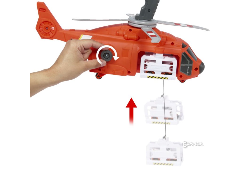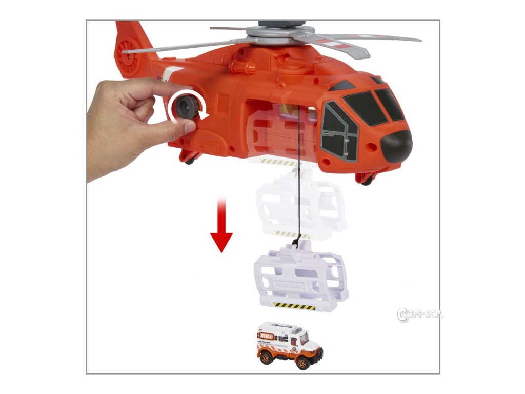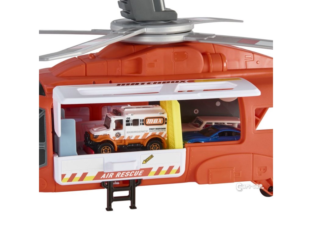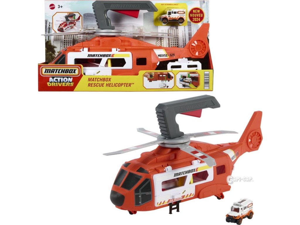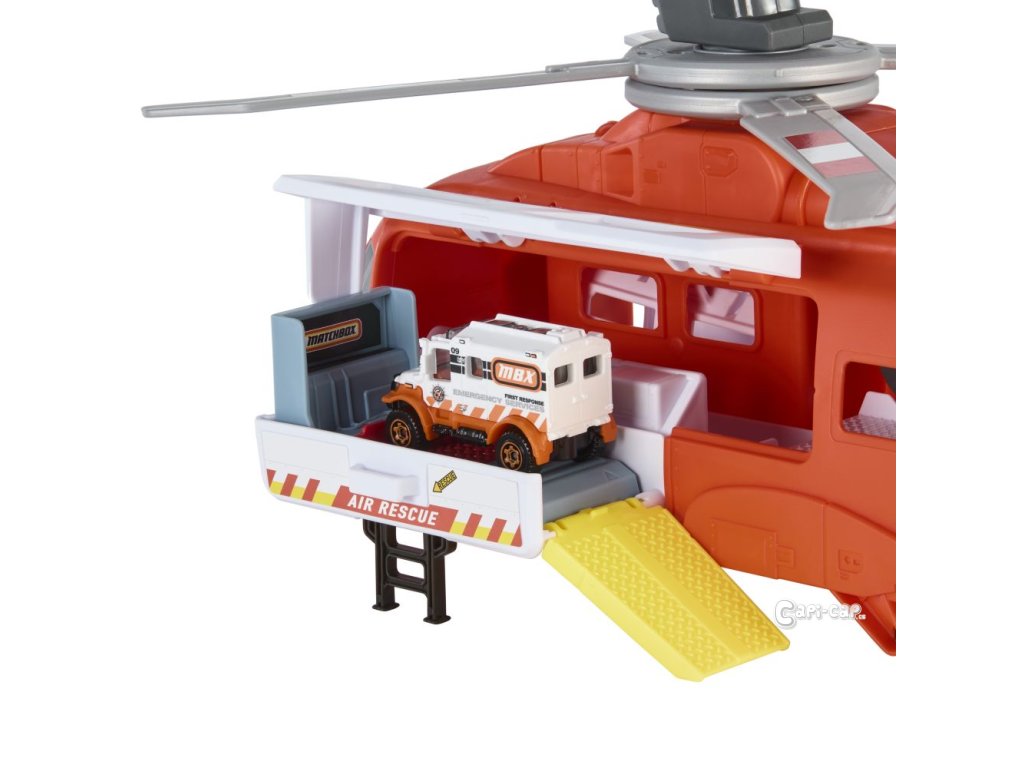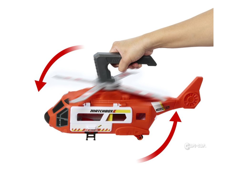 Leťte se záchranným vrtulníkem Matchbox™ na pomoc! Tato cca 40 cm velká helikoptéra má vrtuli ovládanou dětmi, funkční naviják a lze ji proměnit v řídicí jednotku umožňující plnit záchrannou misi. Stisknutím páčky na rukojeti aktivujete vrtuli a "vletíte" na místo zásahu. Ze vzduchu spustíte naviják a zvednete autíčko v měřítku 1:64, které přenesete na palubu a zachráníte tak situaci. Součástí je kovová sanitka v měřítku 1:64.