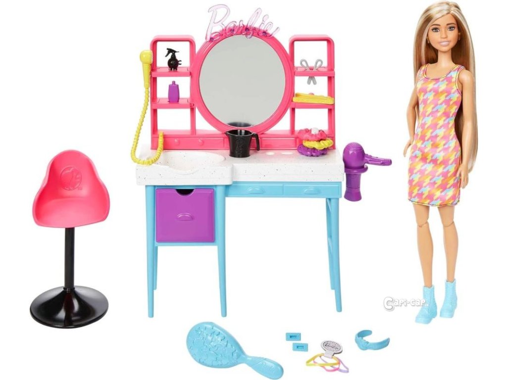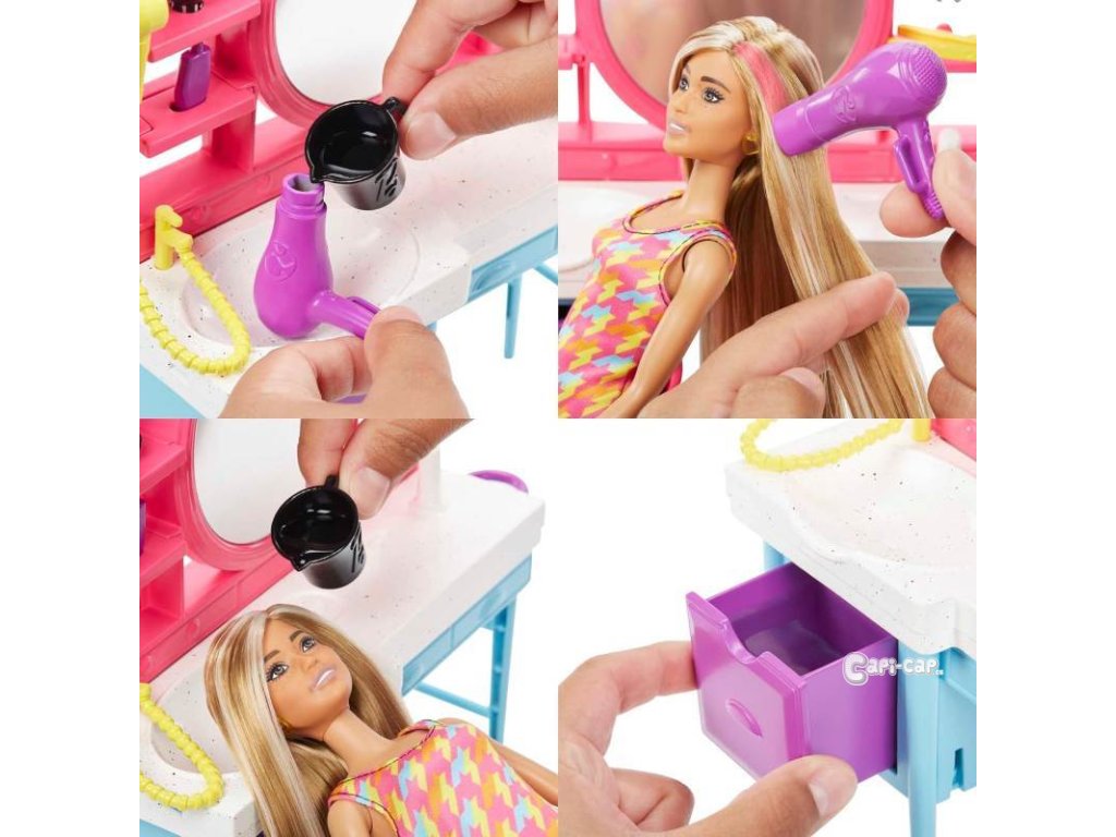 Tato herní sada Barbie Totally Hair inspiruje ke kreativnímu vyprávění příběhů a hraní rolí díky toaletnímu stolku, více než 15 doplňkům a panence s hratelnými vlasy, které lze měnit. Děti mohou pomocí stylingových dílků vytvořit úžasný vzhled a pak se vykartáčovat a začít znovu s dalším velkým nápadem! Panenka nemůže stát samostatně.