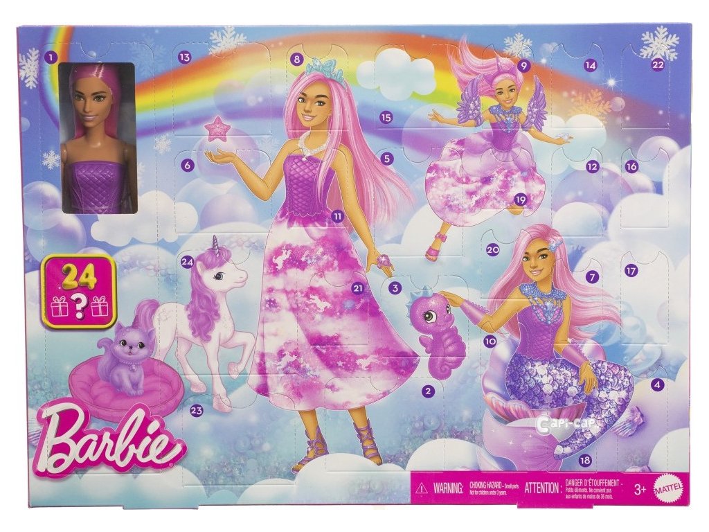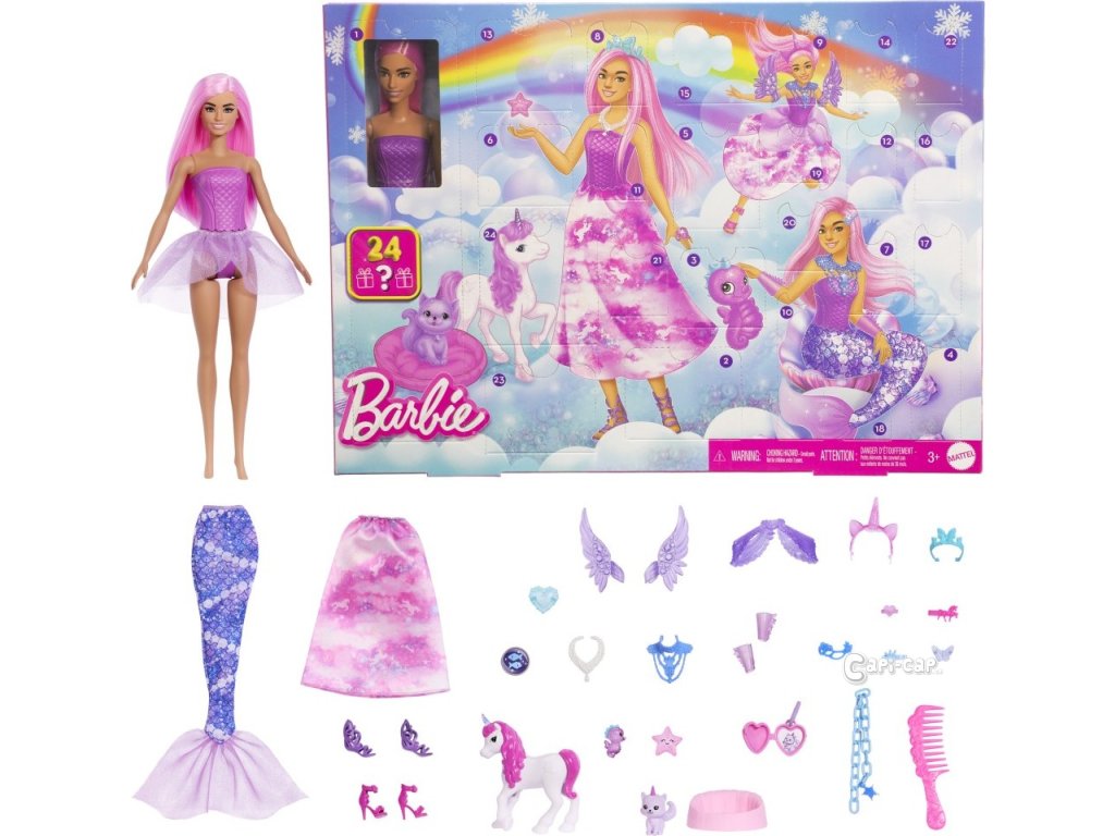 Odpočítávejte dny do Vánoc s tímto Barbie adventním kalendářem plným dárků s kouzelnou tematikou! Po dobu 24 dní si každý den otevřete jedno překvapení (nebo je klidně otevřete všechny najednou!) a zažijte kouzelný zážitek při rozbalování. První den najdete v kalendáři panenku Barbie s krásnými růžovými vlasy a ty další potom oblečení a doplňky, které ji promění v mořskou pannu, královnu nebo vílu. Mezi překvapení patří ocas mořské panny, vílí křídla, malý jednorožec a další pohádkoví zvířecí kamarádi, ozdobné čelenky a další. S tímto setem se děti mohou těšit na kouzelné svátky! Panenka nemůže stát samostatně. Barvy a vzhled výrobku se mohou lišit.