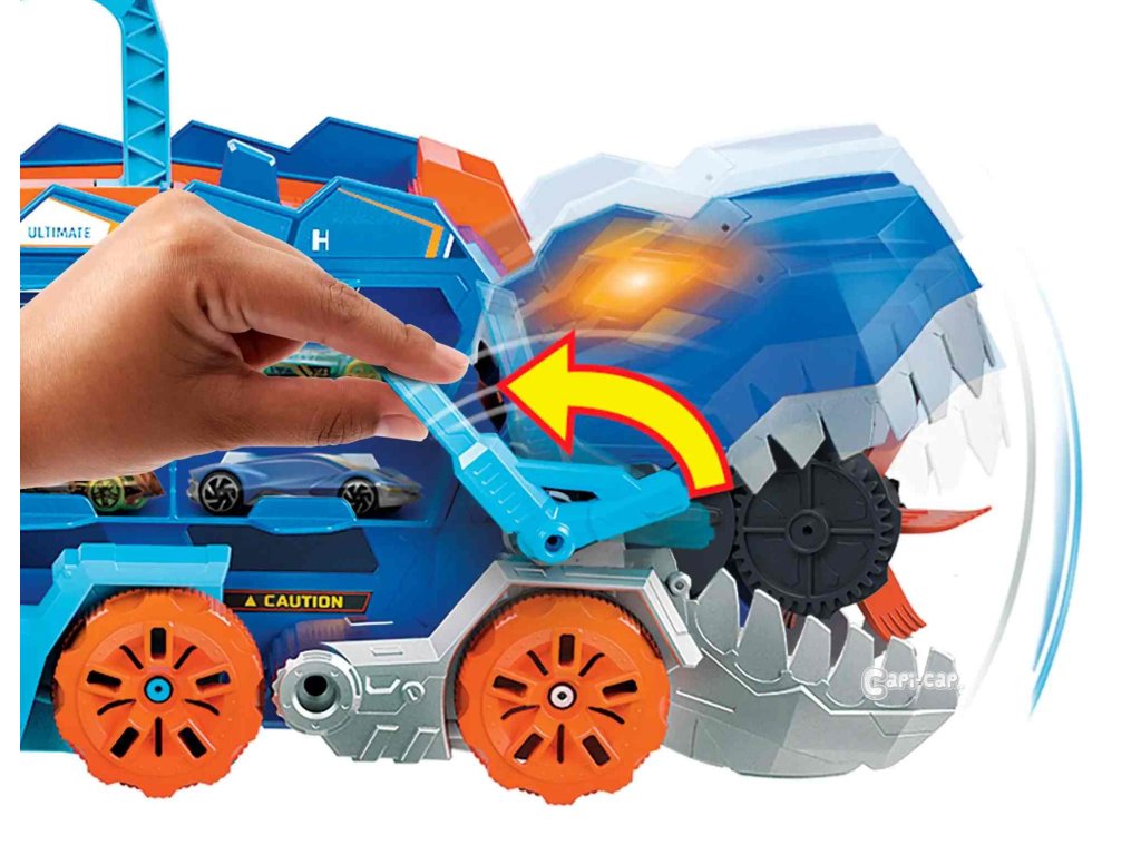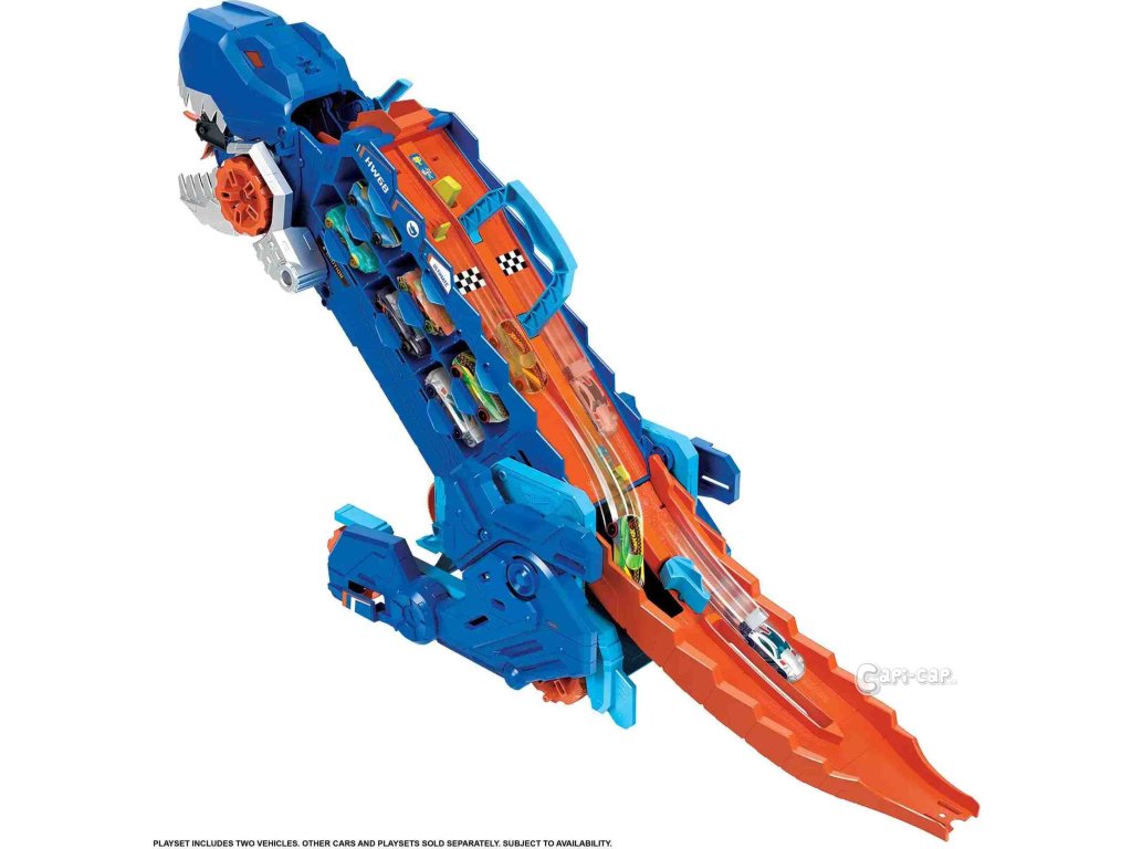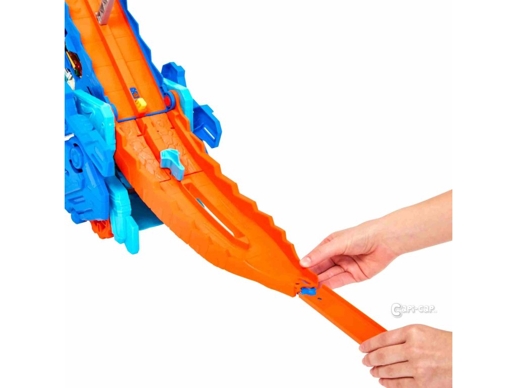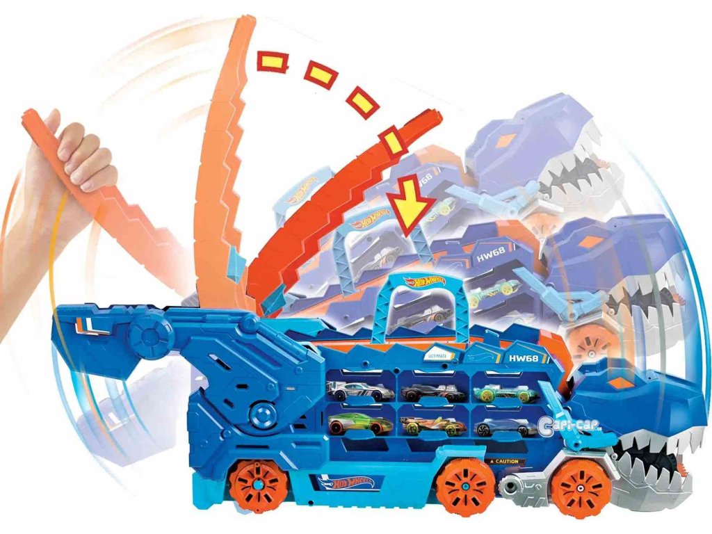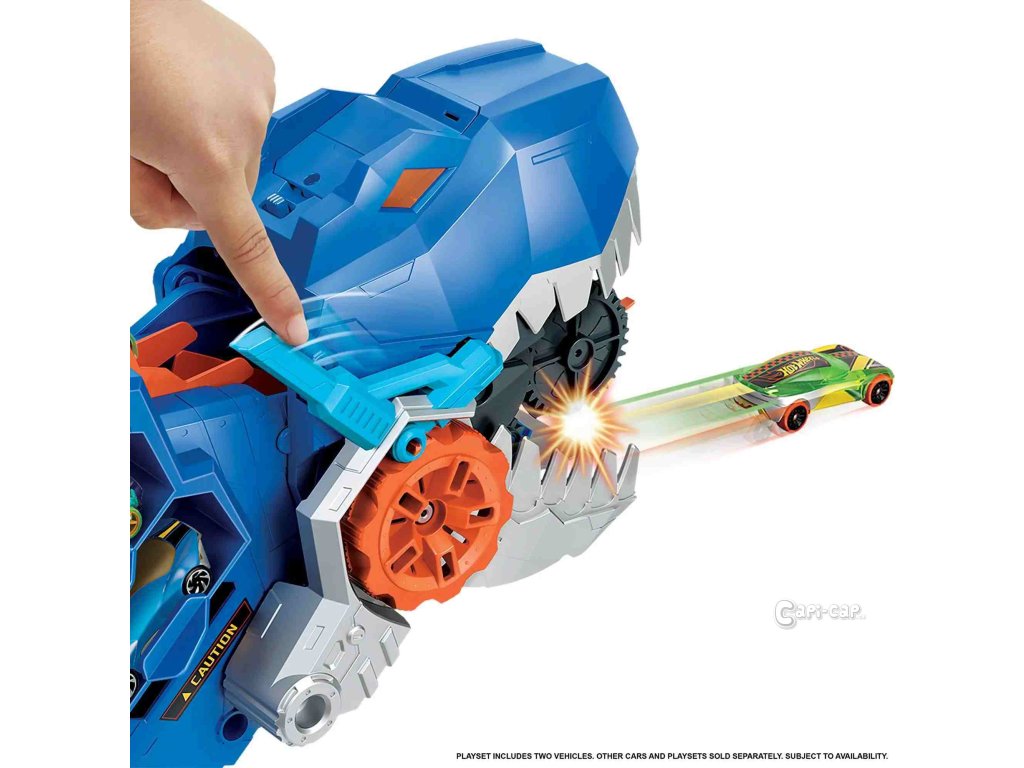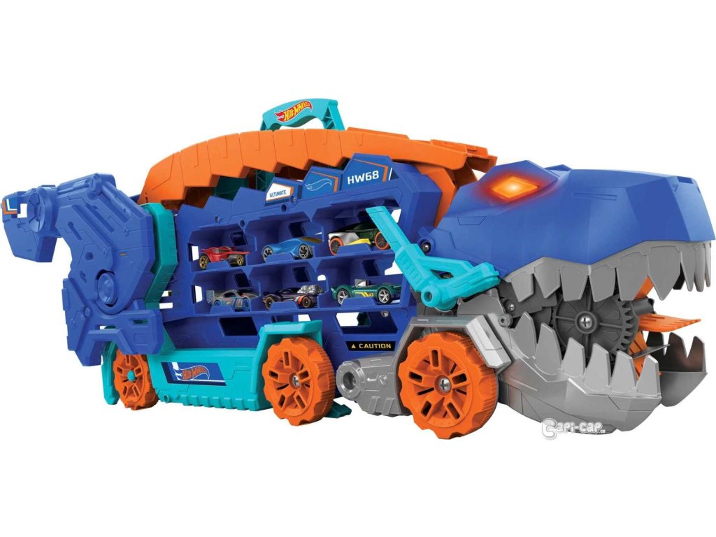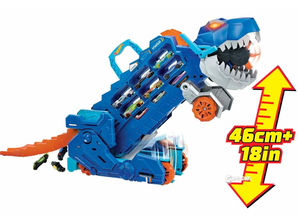 Hot Wheels™ City T-Rex tahač se světly a zvuky nejenže pojme více než 20 angličáků Hot Wheels®, ale také se dokáže proměnit v T-Rexe, který poté, co sežere autíčka, je vykaká! Tento impozantní tahač je vybaven světelnými a zvukovými efekty a nabízí neuvěřitelnou hru na dráze, která je umístěna na T-Rexově hřbetě. Součástí balení jsou dva angličáky Hot Wheels®. Barvy a vzhled výrobku se mohou lišit.