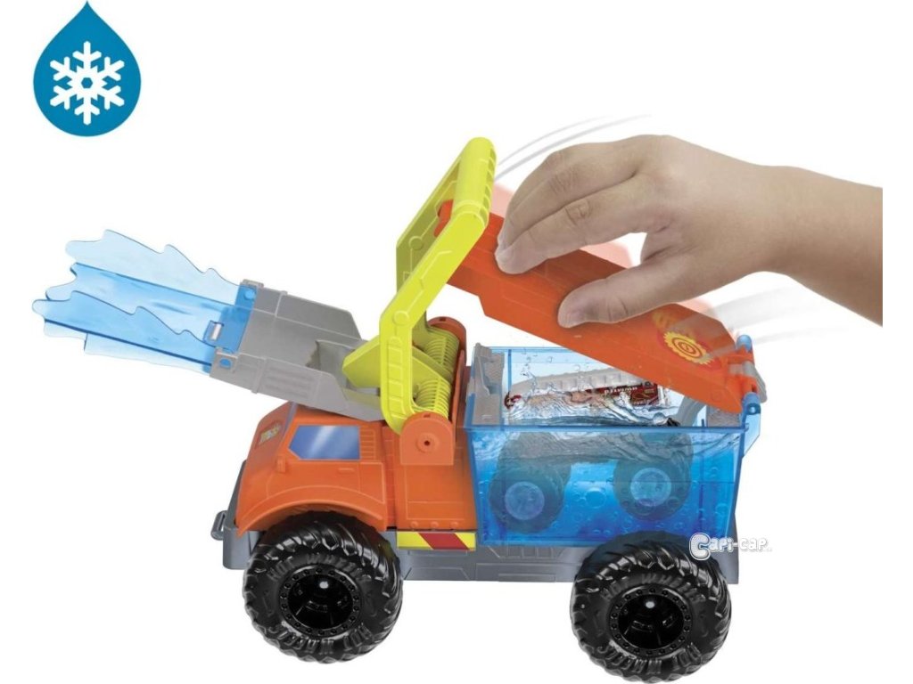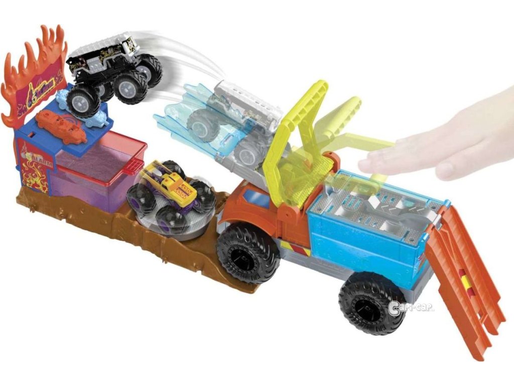Sada Hot Wheels Monster Truck Fire Crash – vyjeď s přiloženým autem HW 5 Alarm Color Shifters HW na rampu, přímo do nádrže s ledovou vodou odpojitelného návěsu. Ucítíš, jak se při plném výkonu pohybuje a třese, když stiskneš rampu a nádrž a spustíš tak změnu barvy. Zvedni náklaďák na plošinu, abys vypustil vodu, a pak pomocí vystřelovače pošli 5 alarmů do plamenů – na záchranu!Přesně stiskni klíčový bod a auto narazí do tribuny plné přiložených drtitelných autíček, srazí všechna vozidla do nádrže s horkou vodou a spustí další změnu barvy. Součástí balení jsou dvě mačkací auta Color Shifters. Umístěte 5 Alarm auto na rychleschnoucí plošinu, abyste odstranili přebytečnou vodu před zahájením další bitvy.