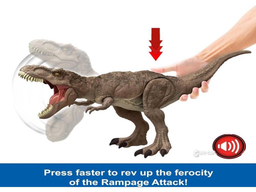 Je to totální útok! Tato akční figurka Tyrannosaurus rex, inspirovaná hrou Jurassic World: Chaos Theory, posouvá ikonický druh na jinou úroveň, násilným útokem se zběsilým mlácením do krku, doprovázeným divokým řevem.