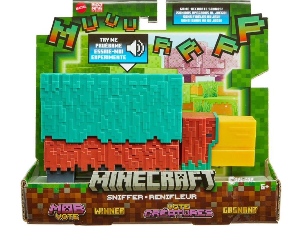 Tato figurka Sniffera o velikosti 8 cm vydává přesné zvuky ze hry, které umocňují zábavu. Jednoduše jednou stiskněte Sniffera a uslyšíte chrochtání; poté stiskněte a podržte, abyste slyšeli zvuky čichání. Fanoušky oblíbený Sniffer zůstává věrný pixelovanému designu Minecraftu a vytváří ještě více příležitostí k vyprávění.