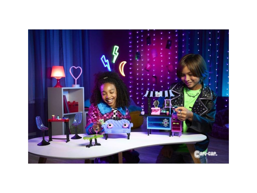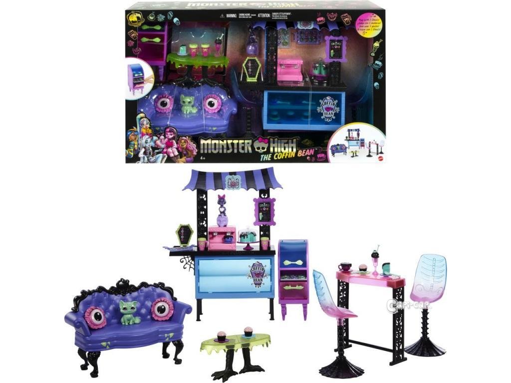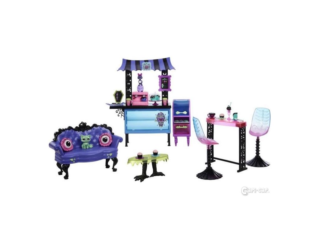 V její nabídce sice nejsou ďábelské toasty, ale ďábelsky dobré je tam úplně všechno! Dortíčky, zákusky, mléčný koktejl i cupcakes! Monsterky si tak nerušeně užívají klábosení i přítulnost domácích mazlíčků. Tahle úžasná kavárna nabízí místa k sezení hned pro pět monsterek a ty si mohou vybrat, která ze tří částí kavárny jim vyhovuje nejlépe! Díky velkému množství příslušenství (více než 20 kousků samostatných herních prvků) je kavárna místem, kde nuda nemá šanci! Panenky nejsou součástí balení. Každá se prodává samostatně v závislosti na dostupnosti.